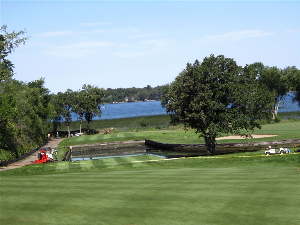[The first job on Hole No. 7 is draining the water hazard. Then the crumbling “walls” will be removed. The hole will be filled and the new green, still in the shape of Minnesota, will be moved back closer to Lake Darling.]