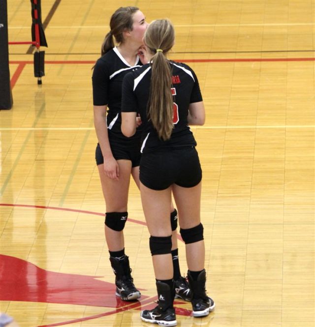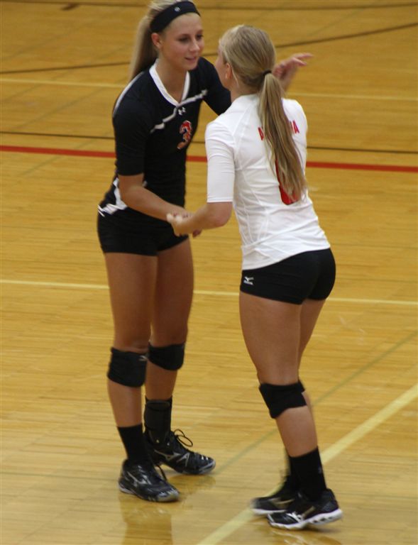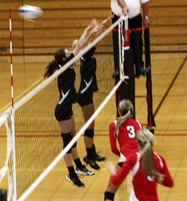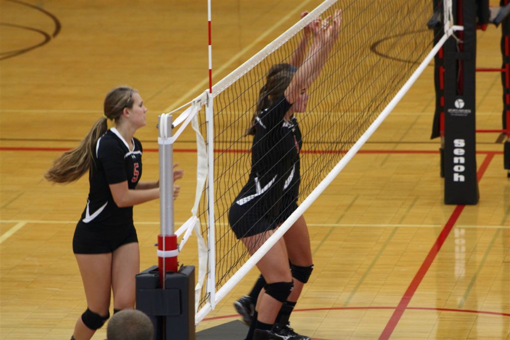 [Senior setters Nicole Canavati (2) and Allie Noetzelman (1) are at the net.]