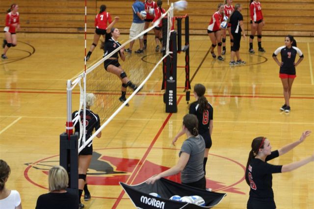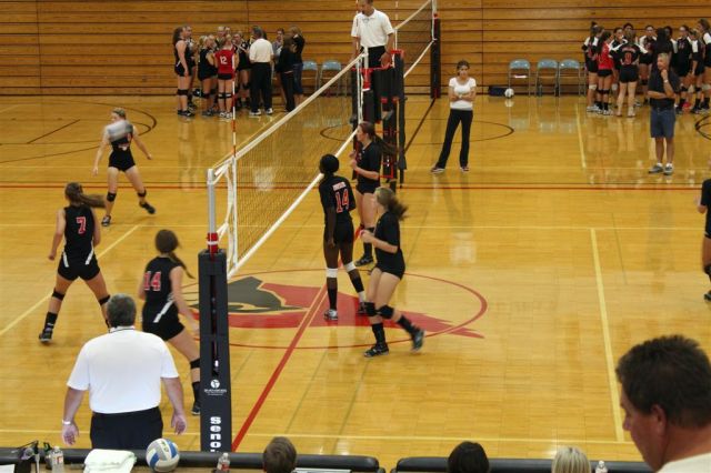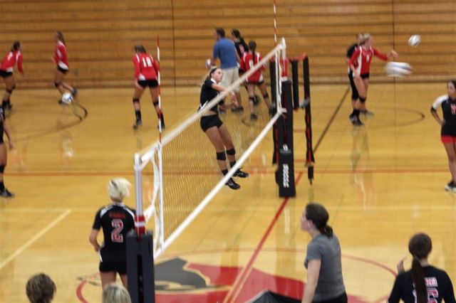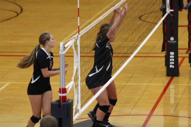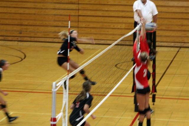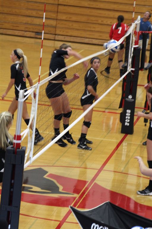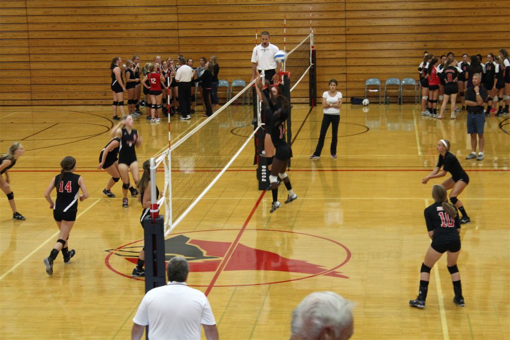 [In the JV game, I recognized Wensia Johnson (14) from the track team. She’s a freshman this year and went up with a double block below.]