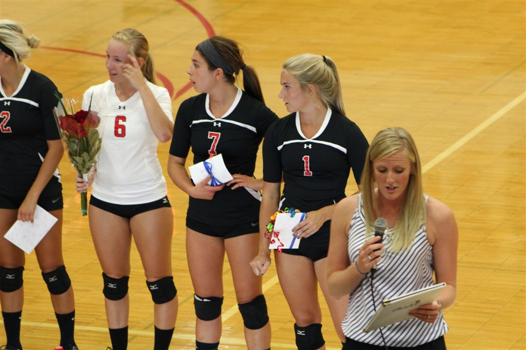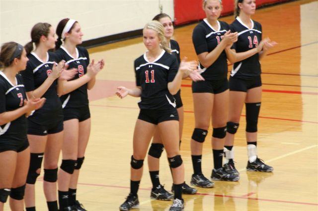 [Player introductions. Amanda Haack (11). Each player does a quick step out and wave as they are introduced. Sitting miles away in the stands sometimes their move is even too quick for my ultra hi-tech camera and they blur. I will include those that come out pretty good and try catch everybody in later games.]