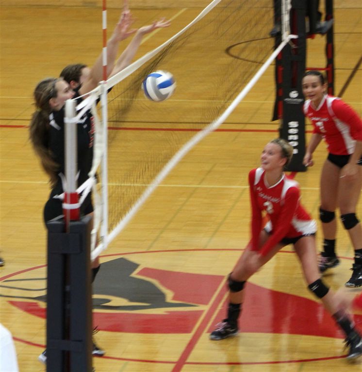 [Amanda (5) and Adrianne (4) ready at the net.]