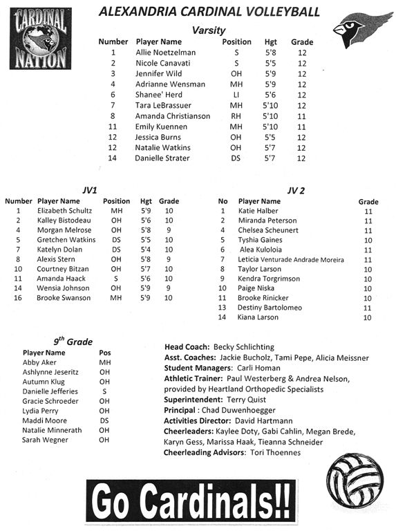 Hi Tom, I very much enjoyed reading your blog! You have such a great sense of humor! 🙂 Not only are the roster numbers incorrect, but we really do have a shorter team than what the roster shows, Allie, Jenni and Natalie’s heights are a bit off, but I’m sure Jenni is going to get taller before the season is over. The jersey numbers are correct from #1 through #6, after that the varsity roster sheet is incorrect. You may have already been updated by Marnee’, but if not, here are the correct player numbers: 5 Amanda Christianson; 7 Natalie Watkins; 8 Tara LeBrasseur; 12 Jessica Burns; 13 Emily Kuennen; 14 Danielle Strater; JV1 and dressing for Varsity are: 9 Elizabeth (Liz) Schultz; 11 Amanda Haack ~ Amy