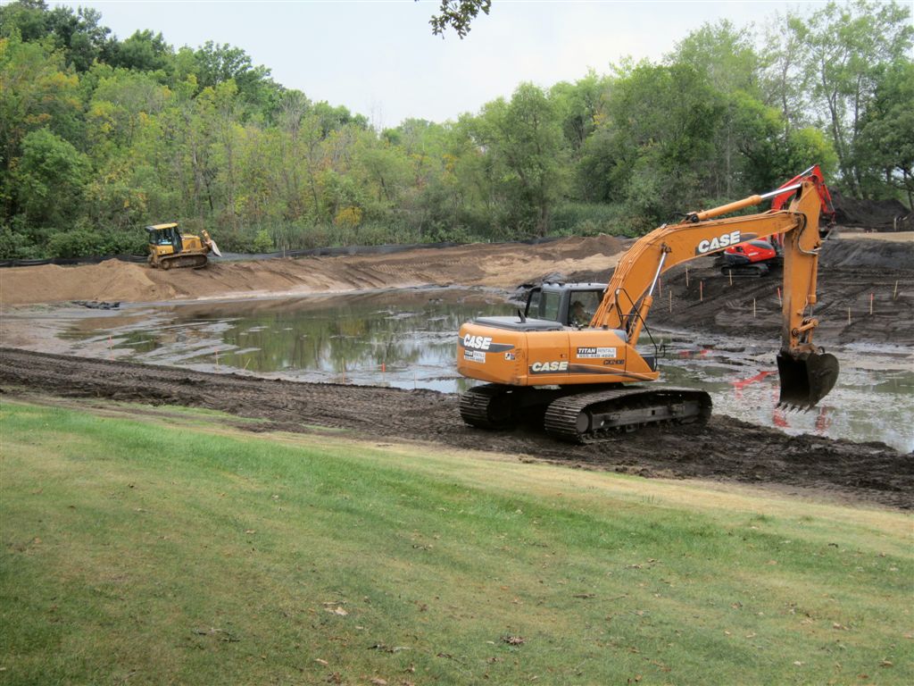 [Dar Hentz and Al Grundei approach the 6th green, from whence one can see the construction project.]
