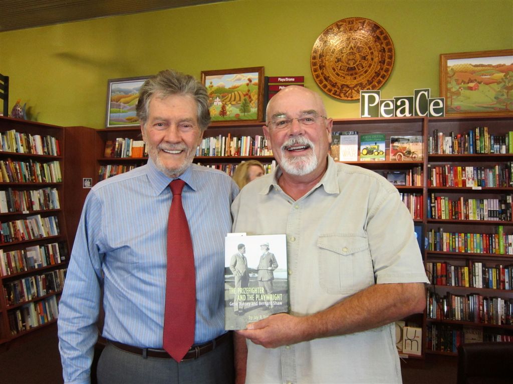The kids arrived from Indiana on Saturday, the 1st, in the wee small hours of the morning. They awoke around noon, ready for the rest of their pilgrimage to the “up north” property. We loaded the back of the supervisor’s pick-up with more supplies, including a trundle bed we have had in the lower level since day one – but we’re happy to start downsizing. I wanted to go to a book signing at Cherry Street Books before they left. So I hustled into town to meet Jay Tunney, son of former heavyweight champion, Gene. Jay has written a book about his dad and his friendship with George Bernard Shaw. I bought his book which he graciously signed, “To Tom: A pioneer in the forward march of the human spirit. Good luck, Jay Tunney” 🙂 We had a brief chat for I had to run – we learned we both spent time in Okinawa, me from 1970-72. He said he was there 20 years earlier than that! Gee, I don’t think he looks that much older than me?