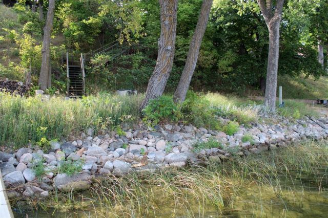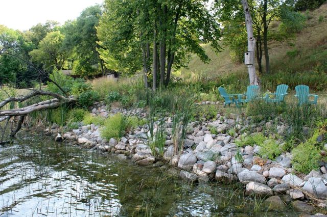 [Our lakescaping has matured and now looks good in the rip-rap (well, we think so!).]
