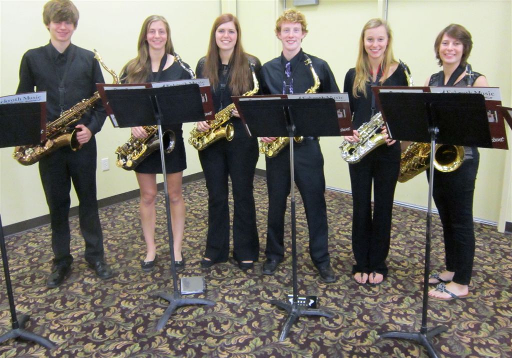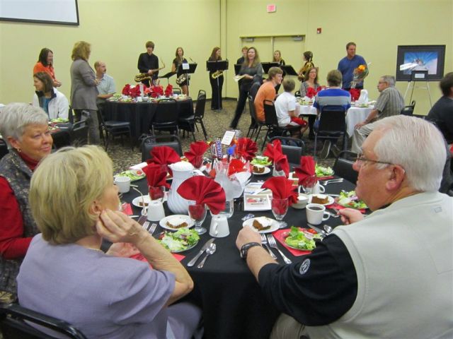 [Our table enjoys the music, our lunch, and, particularly in my case, the Snickers center piece.]