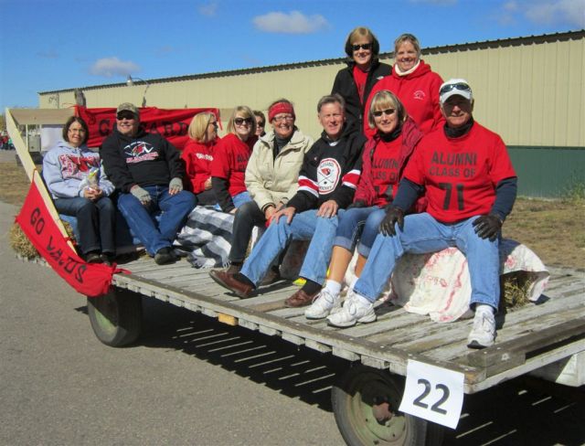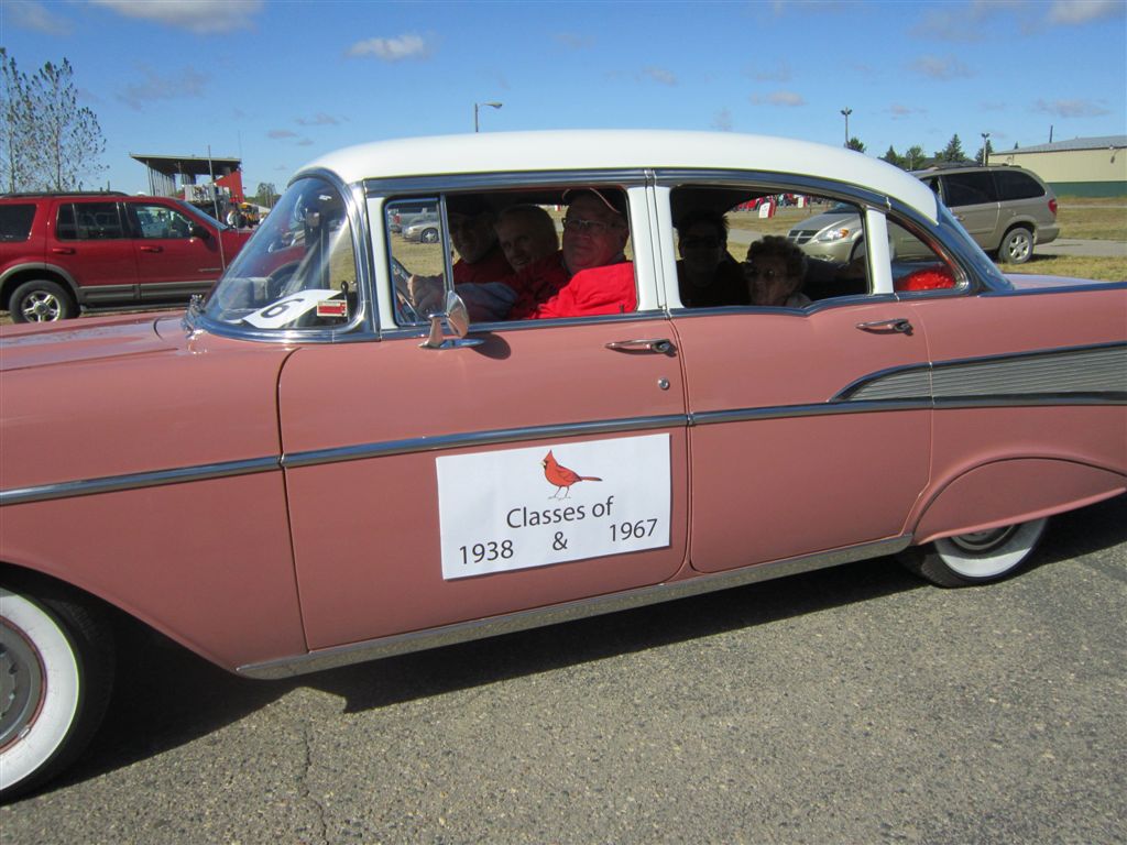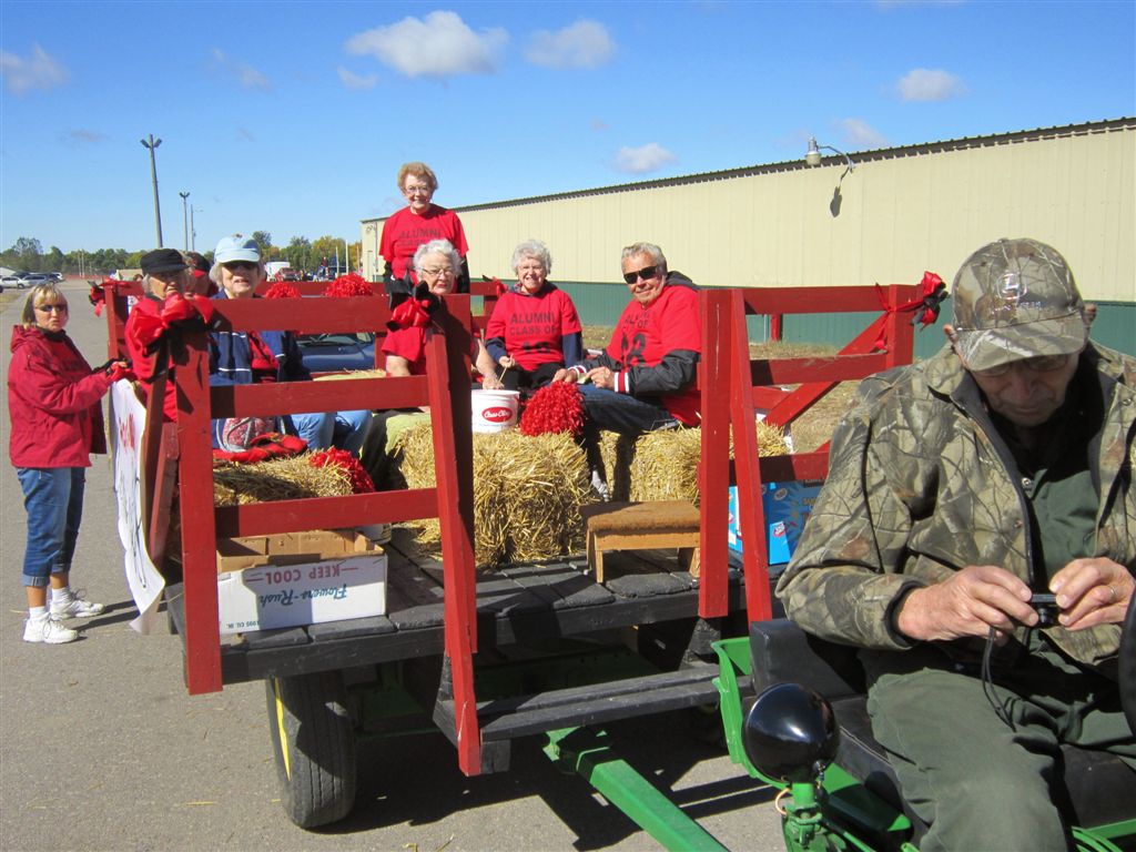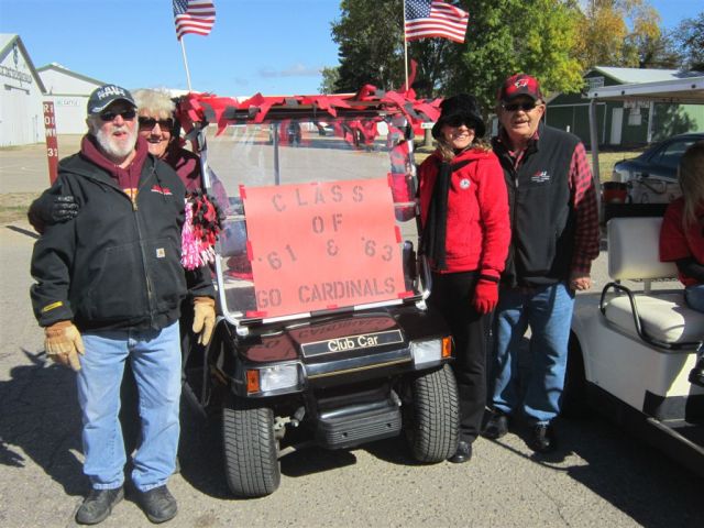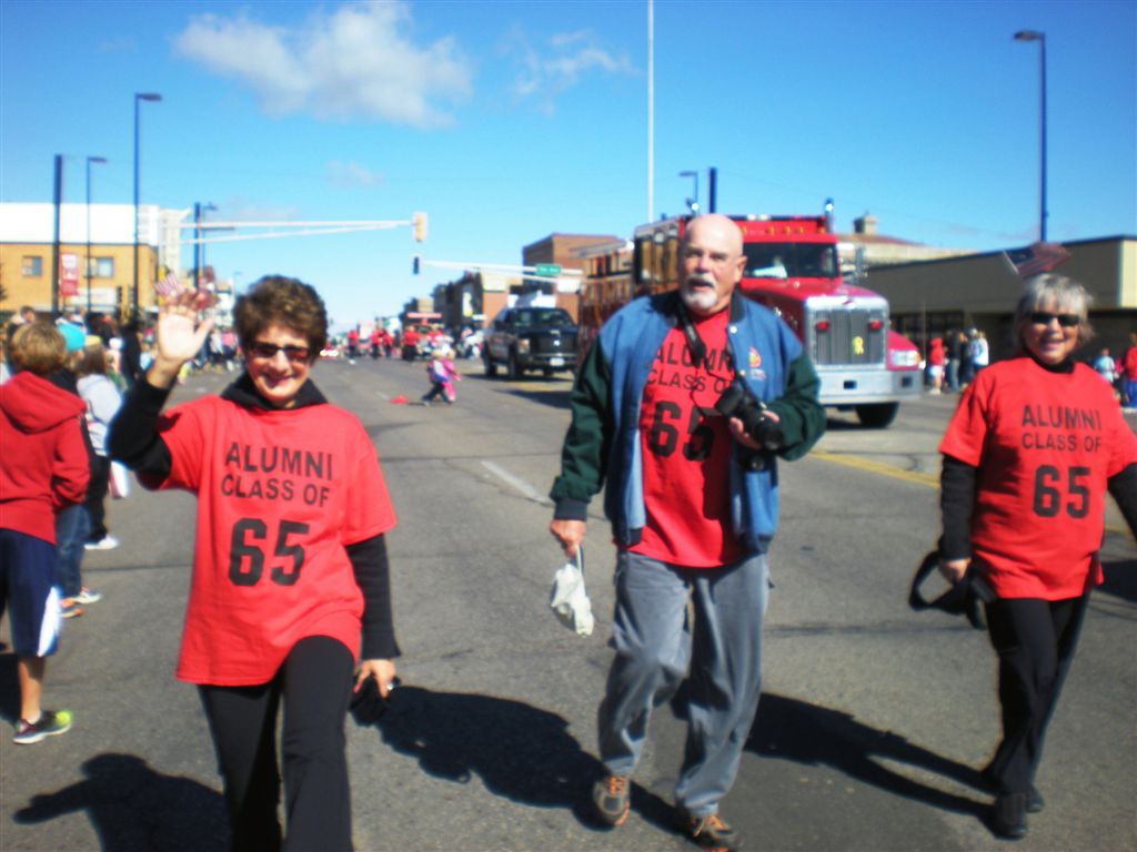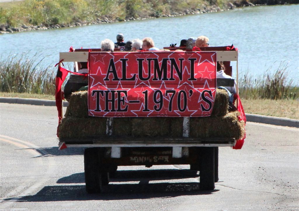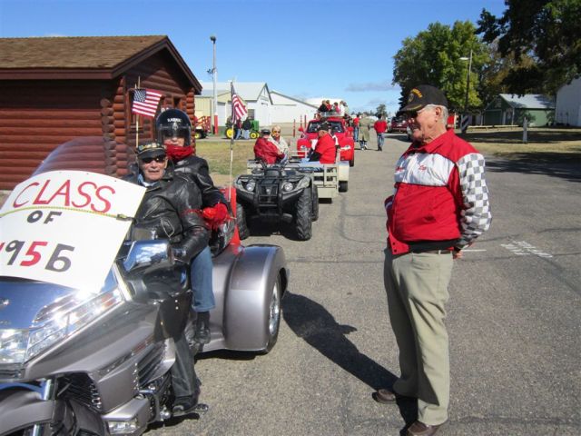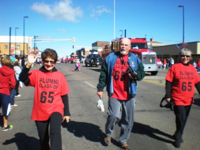 The parade began again this year at the fairgrounds. That’s fine – makes assembly easier. But it totally confused me as to reportorial coverage – well, a lot of things confuse me. In the years the parade begins at the Catholic church, I’m able to stand at the front of the formation and get photos of the Homecoming court and the grand marshals (or is it grands marshal?). But this year, as I entered the fairgrounds two cameras in hand, I noticed all the convertibles at the start of the line-up, but their passengers were out-and-about doing meet-and-greets. So, I continued on – photo ops abounded with floats and alumni of all shapes, sizes, and ages in various conveyances. I think I was somewhere behind a 4H building when movement began – I would never be able to get to the front of the parade to capture the royalty. Classmate Bev (aforementioned) phoned ahead to her husband Cliff to see if he could get them as they came down Broadway. We’re thankful for those he was able to get.