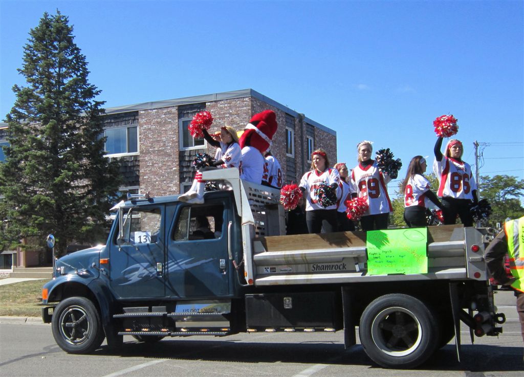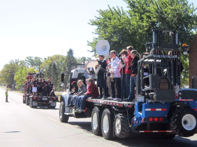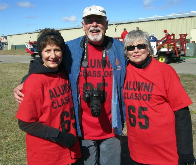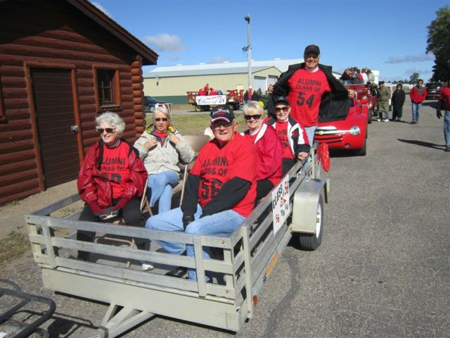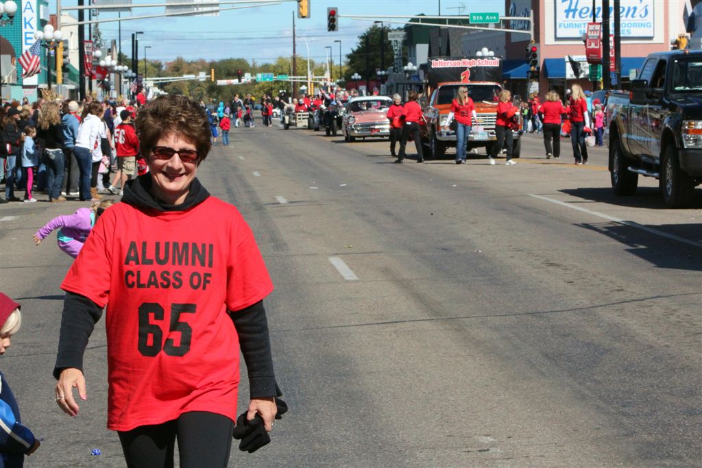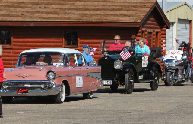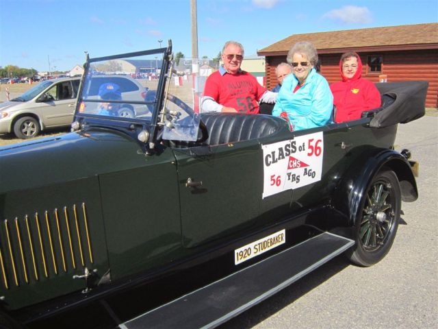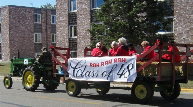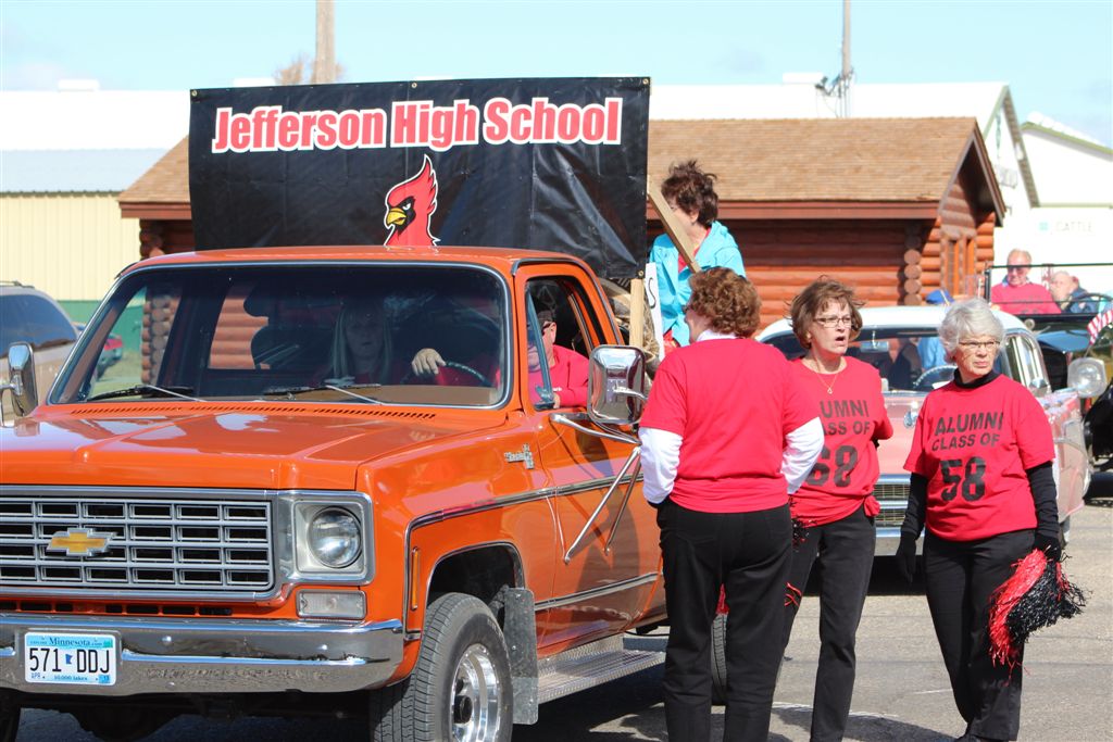 The parade began again this year at the fairgrounds. That’s fine – makes assembly easier. But it totally confused me as to reportorial coverage – well, a lot of things confuse me. In the years the parade begins at the Catholic church, I’m able to stand at the front of the formation and get photos of the Homecoming court and the grand marshals (or is it grands marshal?). But this year, as I entered the fairgrounds two cameras in hand, I noticed all the convertibles at the start of the line-up, but their passengers were out-and-about doing meet-and-greets. So, I continued on – photo ops abounded with floats and alumni of all shapes, sizes, and ages in various conveyances. I think I was somewhere behind a 4H building when movement began – I would never be able to get to the front of the parade to capture the royalty. Classmate Bev (aforementioned) phoned ahead to her husband Cliff to see if he could get them as they came down Broadway. We’re thankful for those he was able to get.