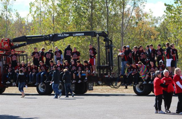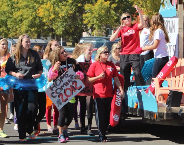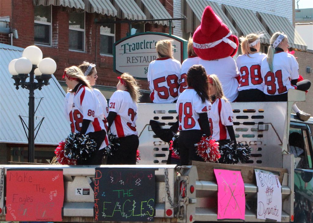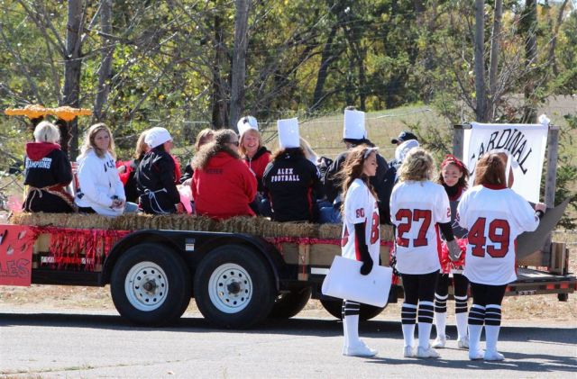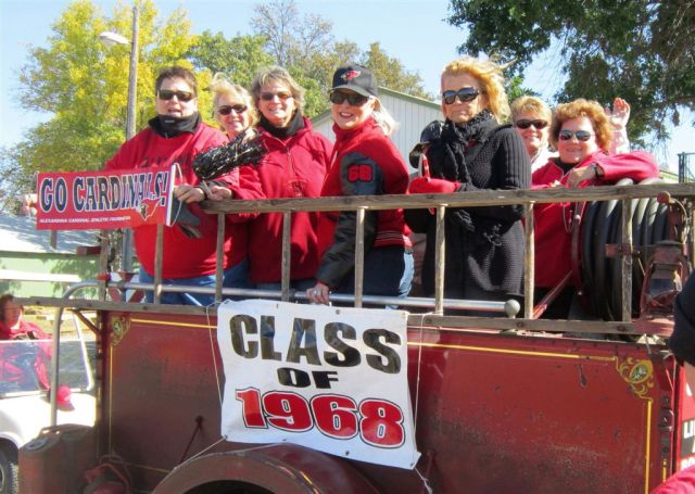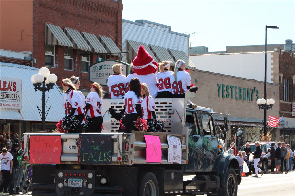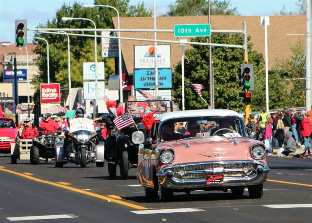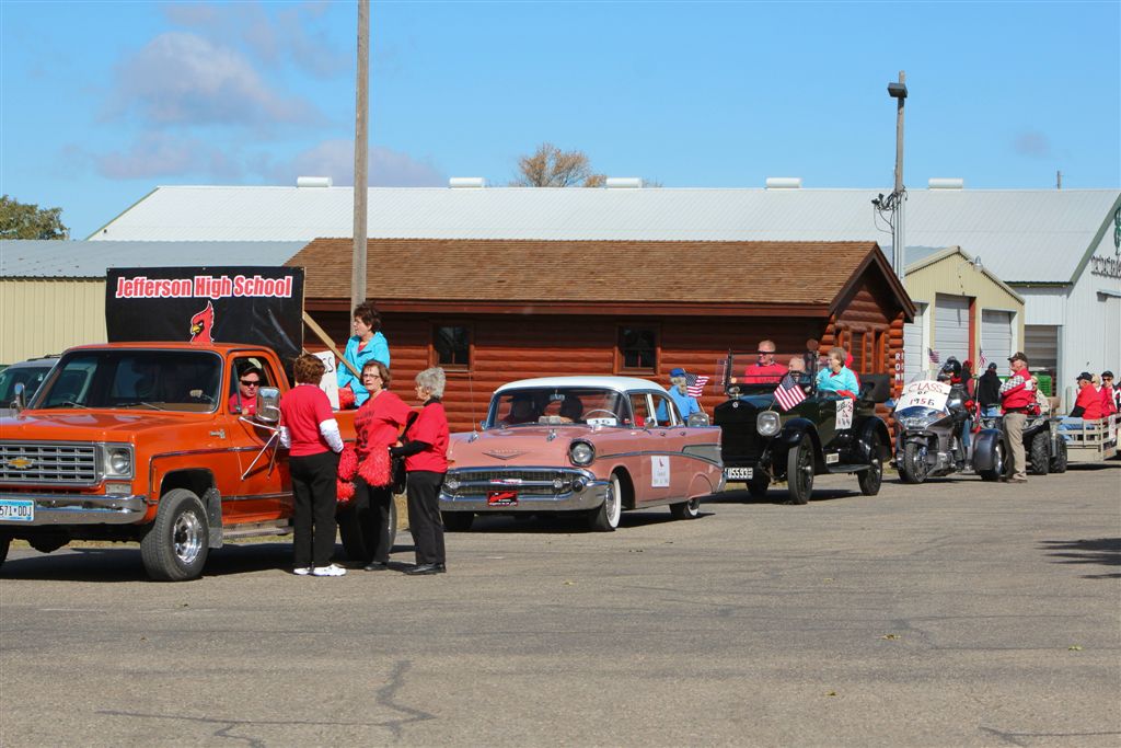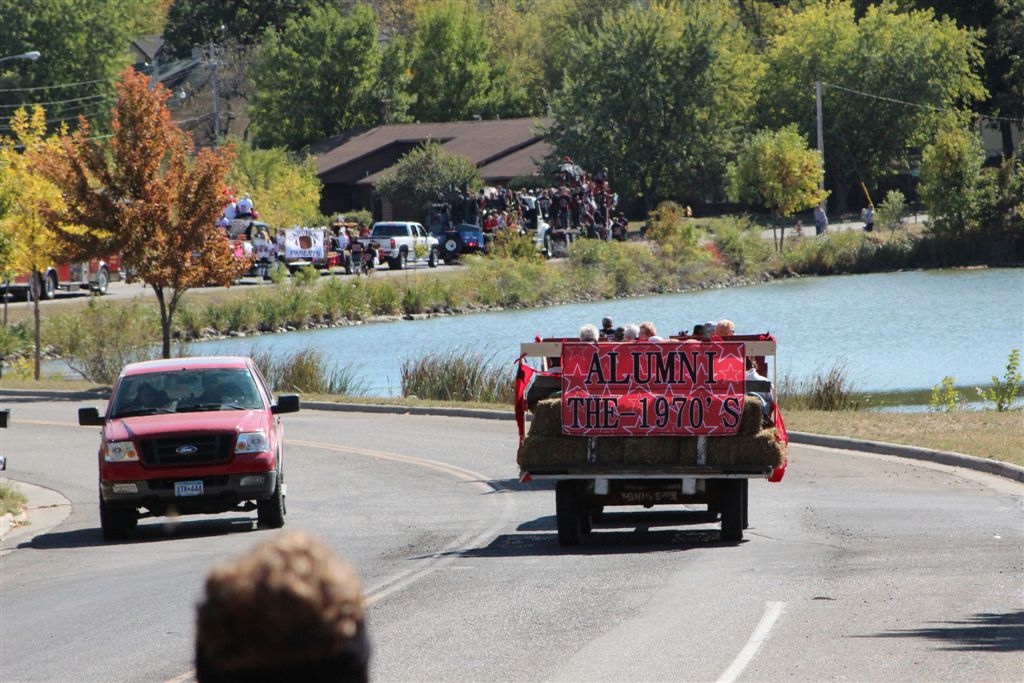 The parade began again this year at the fairgrounds. That’s fine – makes assembly easier. But it totally confused me as to reportorial coverage – well, a lot of things confuse me. In the years the parade begins at the Catholic church, I’m able to stand at the front of the formation and get photos of the Homecoming court and the grand marshals (or is it grands marshal?). But this year, as I entered the fairgrounds two cameras in hand, I noticed all the convertibles at the start of the line-up, but their passengers were out-and-about doing meet-and-greets. So, I continued on – photo ops abounded with floats and alumni of all shapes, sizes, and ages in various conveyances. I think I was somewhere behind a 4H building when movement began – I would never be able to get to the front of the parade to capture the royalty. Classmate Bev (aforementioned) phoned ahead to her husband Cliff to see if he could get them as they came down Broadway. We’re thankful for those he was able to get.