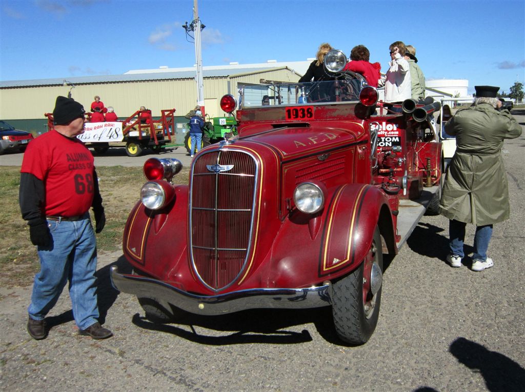 [Tom Akenson’s (rain coat) classic ’38 fire engine ferries the Class of ’68 – at least until they hit Broadway, or so they say. Current fire marshal, Dennis Stark (l), inspects the rig.]
