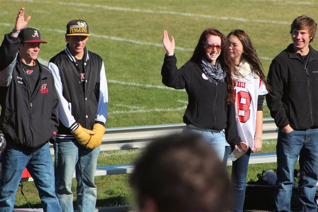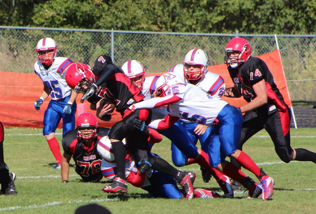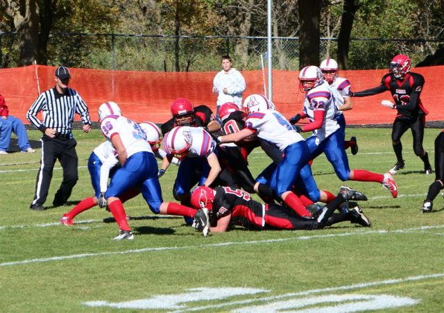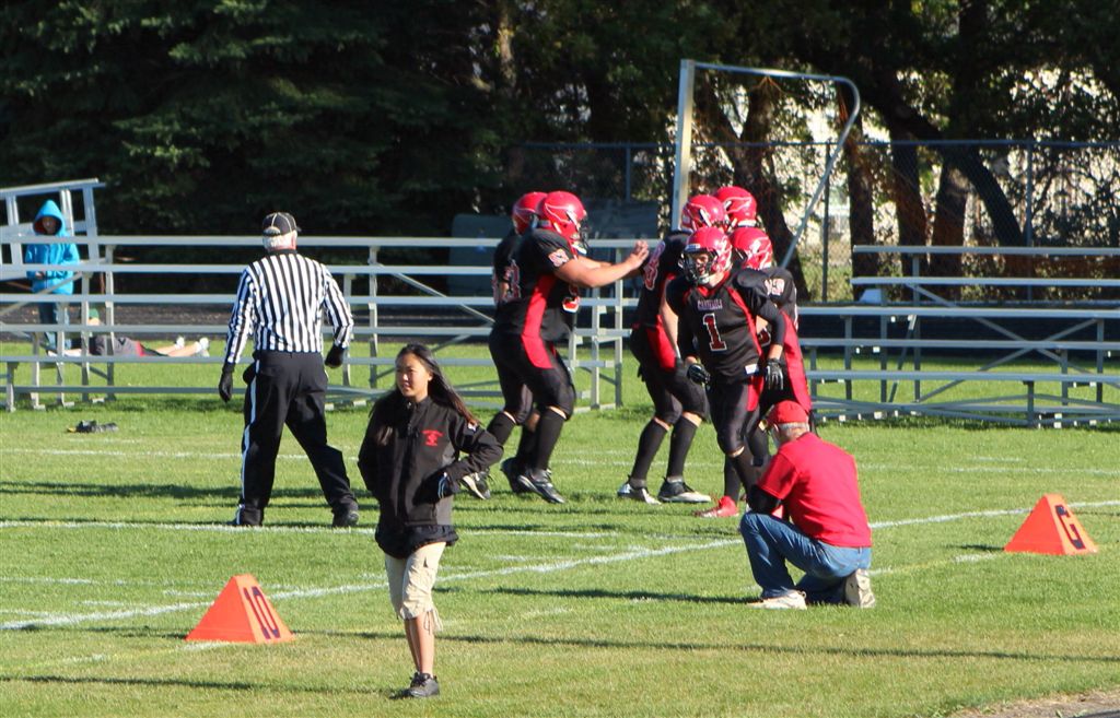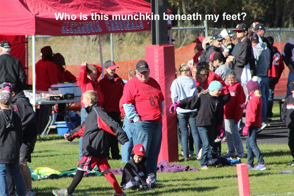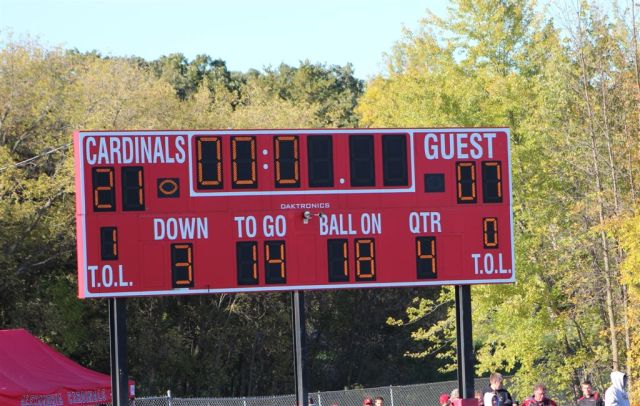 [It’s a Touchdown! Cardinals lead 7 – 0 after the first drive of the game. Sophomore Jake Bear scored the TD, though he is totally lost in the pile. And it looks like we have an excellent place kicker, senior Chandler Davis.]