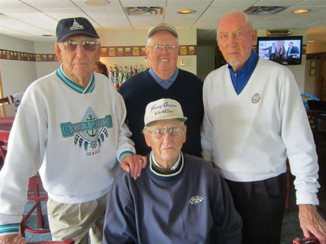 [Standing, 1-r: Dar Hentz, 87; Harry Ramaley, 85; Gordy Anderson, 91. Sitting: Don Hansen, 87. Whatta group! I think 3 of the 4 shot their age this day. An inspiration to all.]