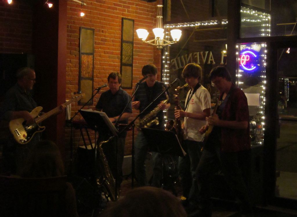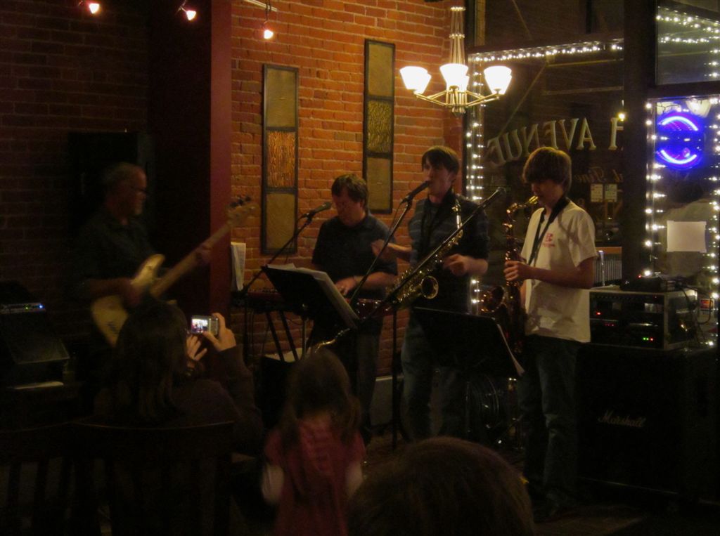 The other saxophonist, Paul Meland, is in the high school band, and he had just played earlier at . . . the volleyball game. I’m sure group leader, founder, and drummer, Bill Engebretson, will fill us in on the names of the other group members. 😉