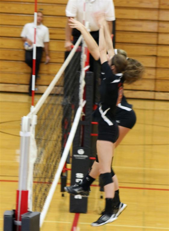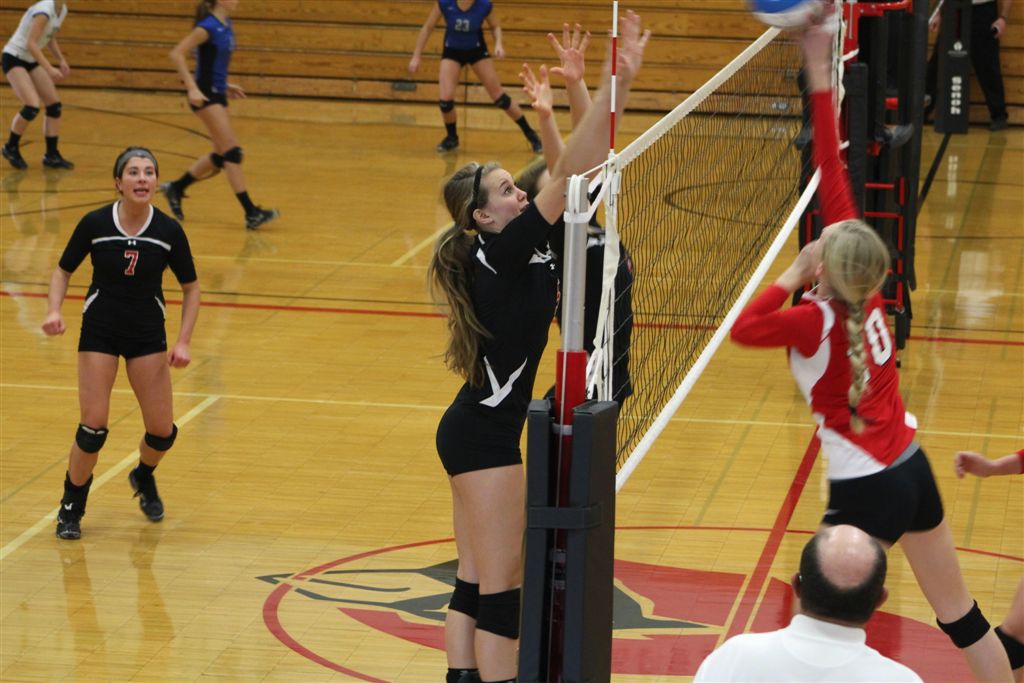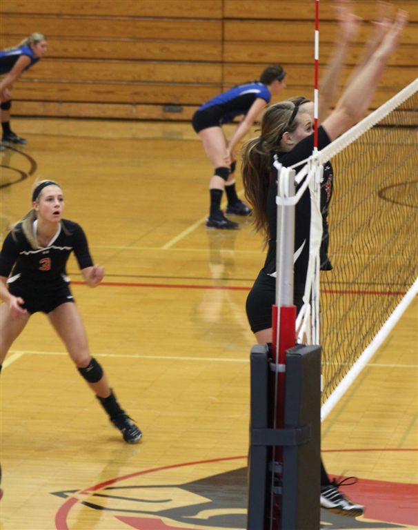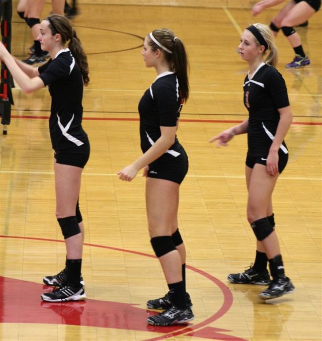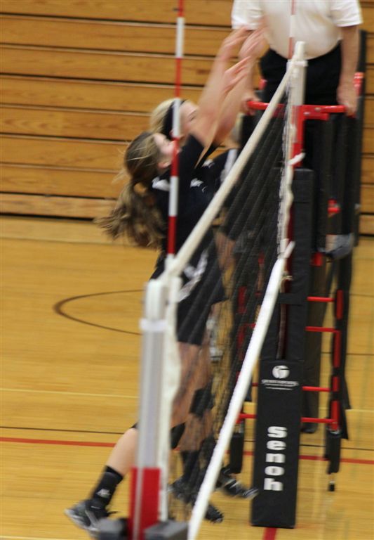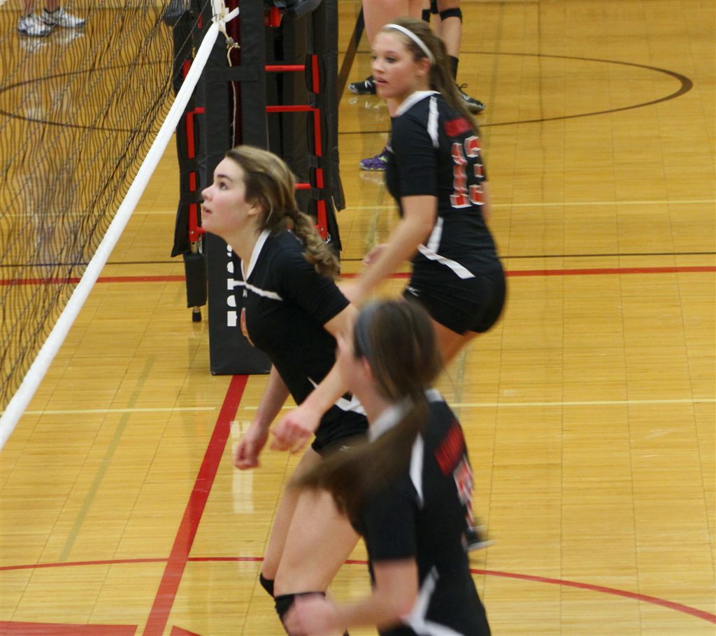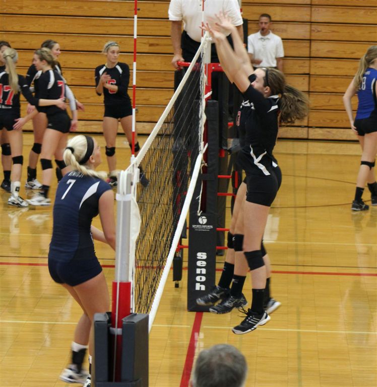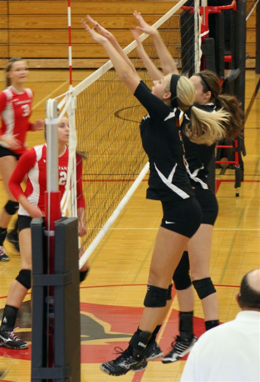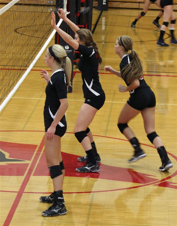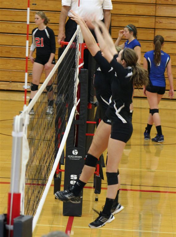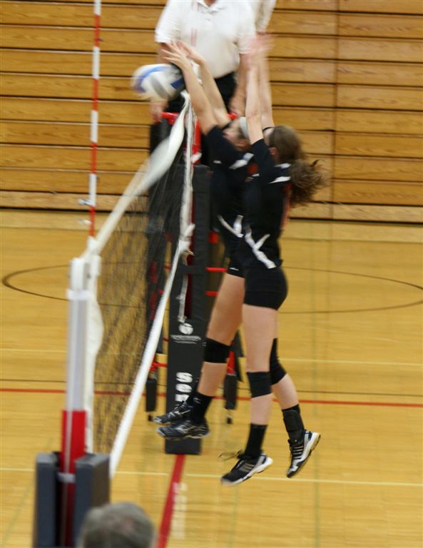 [Junior Amanda Christianson and senior Tara LeBrassuer go up for the block, Jenni’s got their backs.]