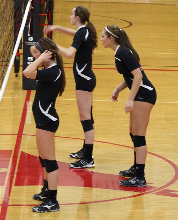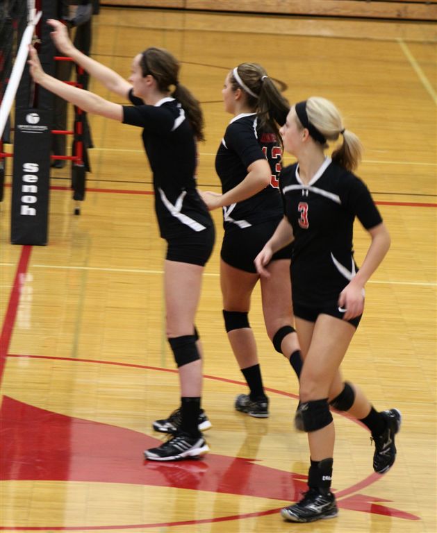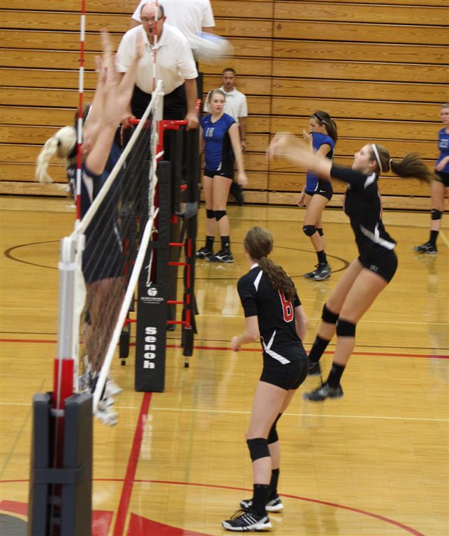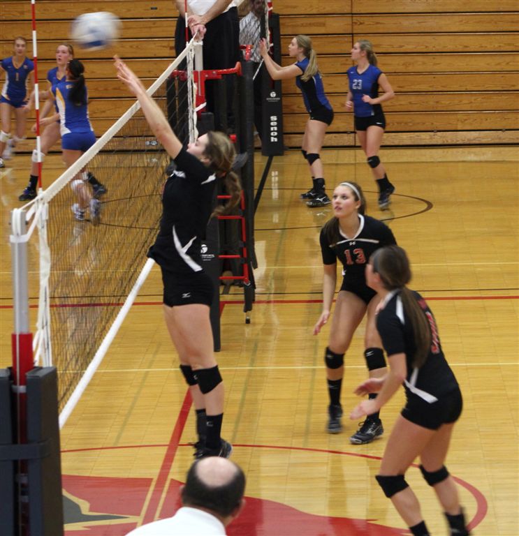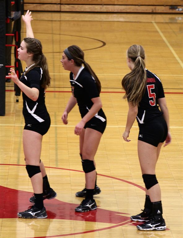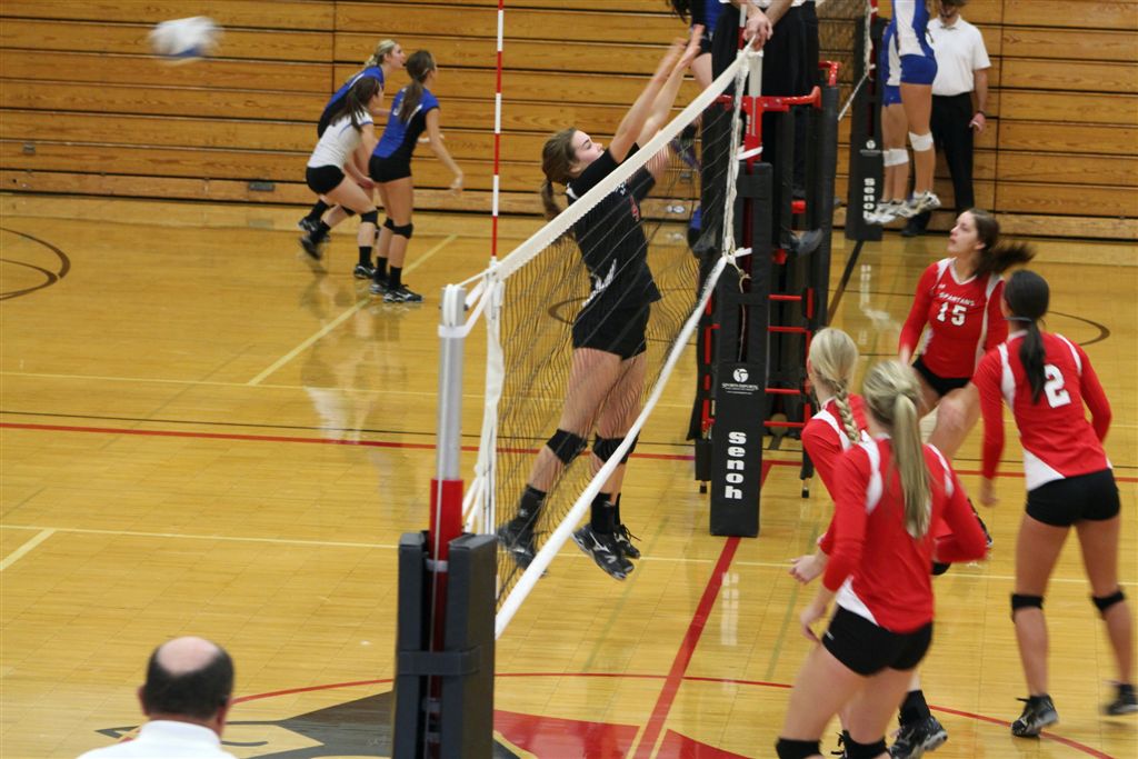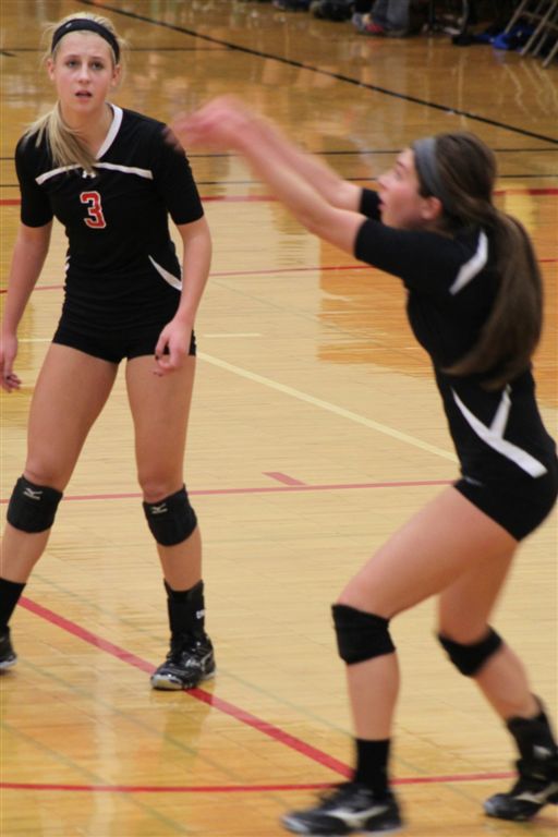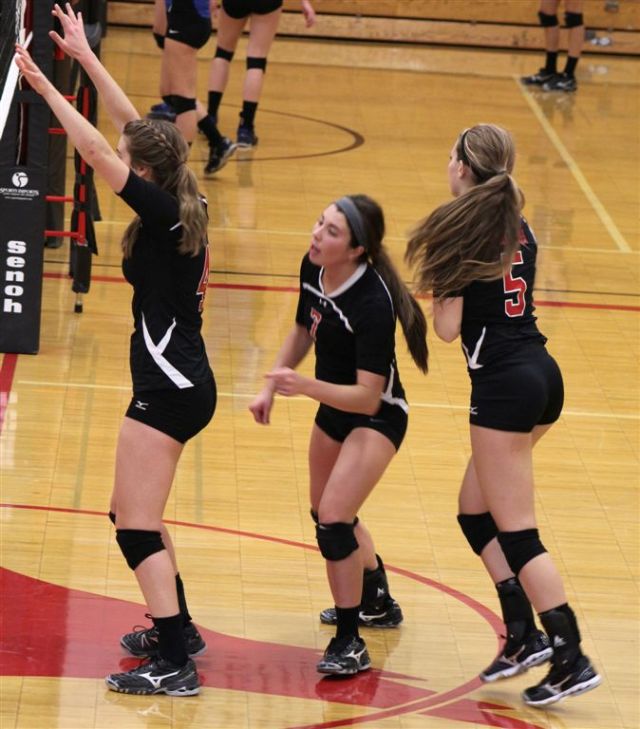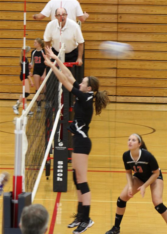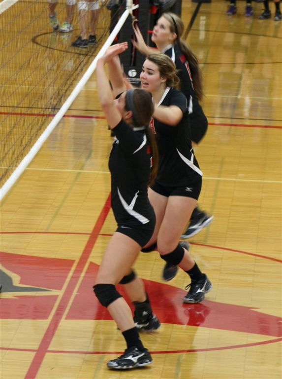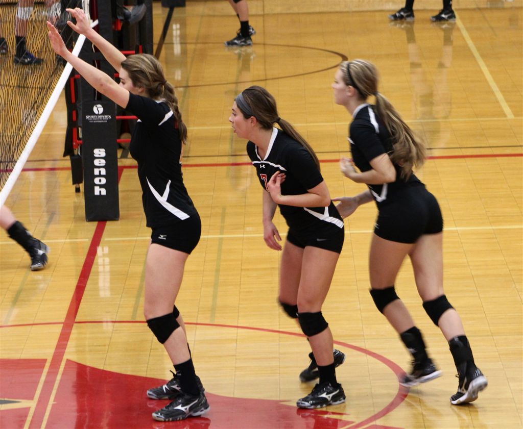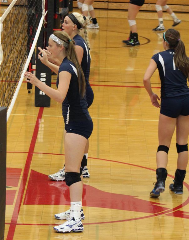 [Junior Amanda Christianson and senior Tara LeBrassuer go up for the block, Jenni’s got their backs.]