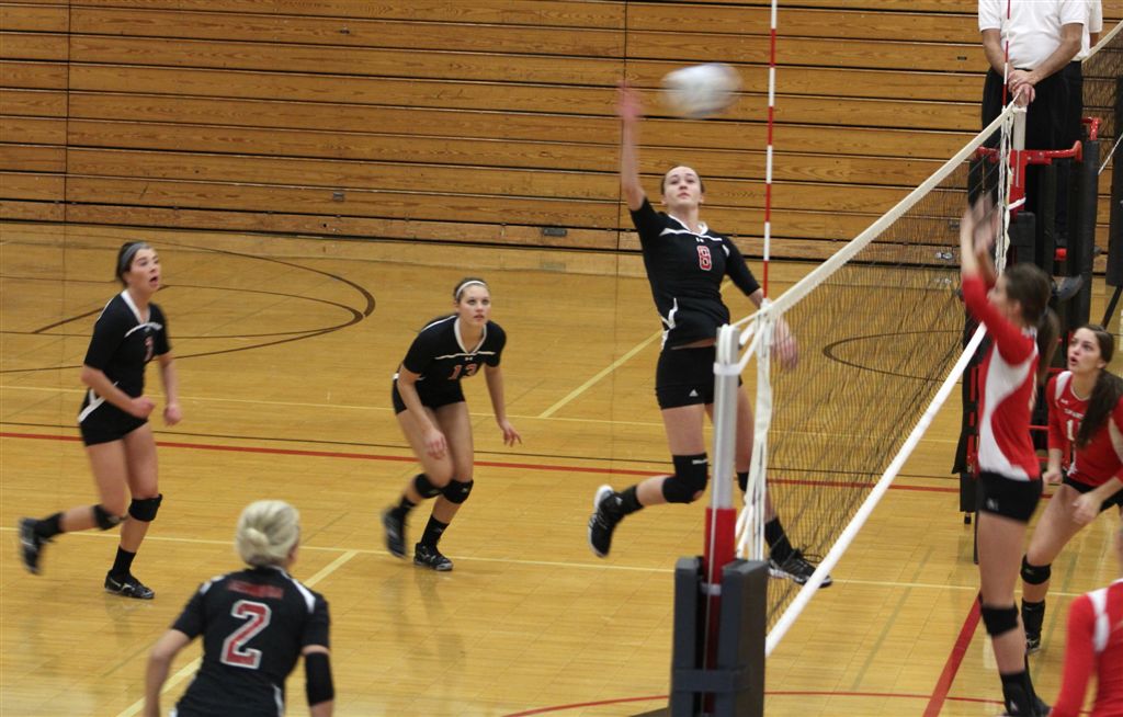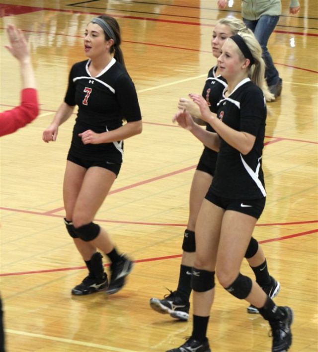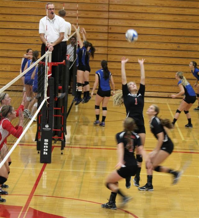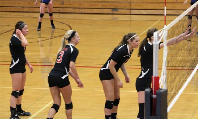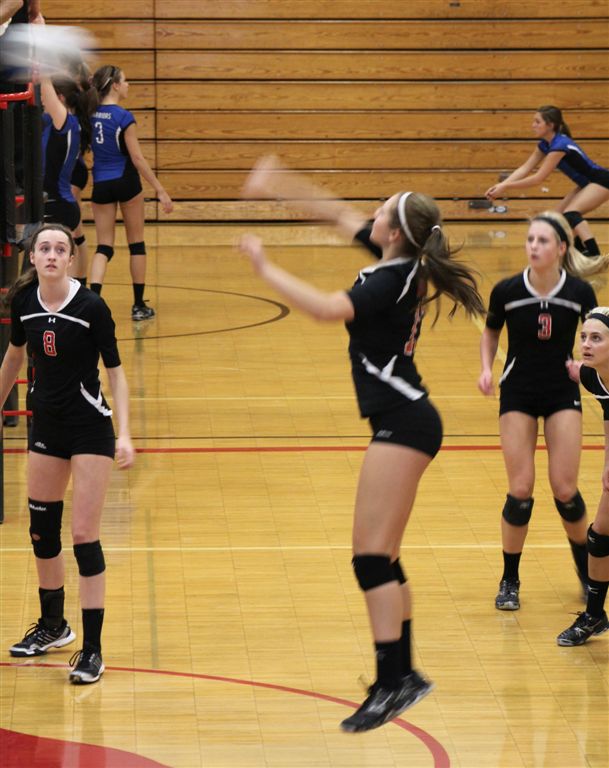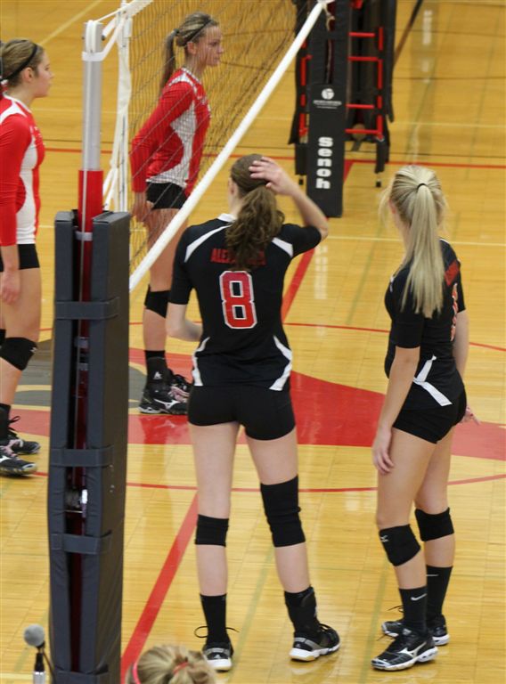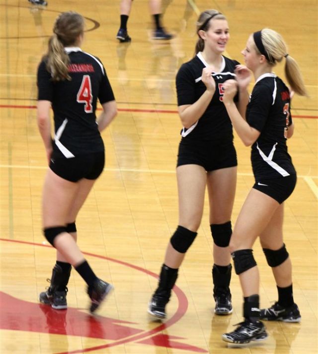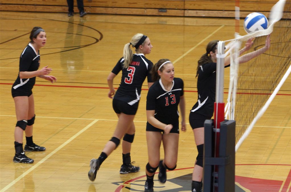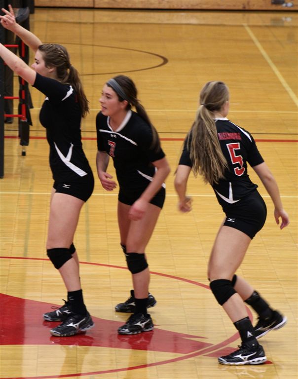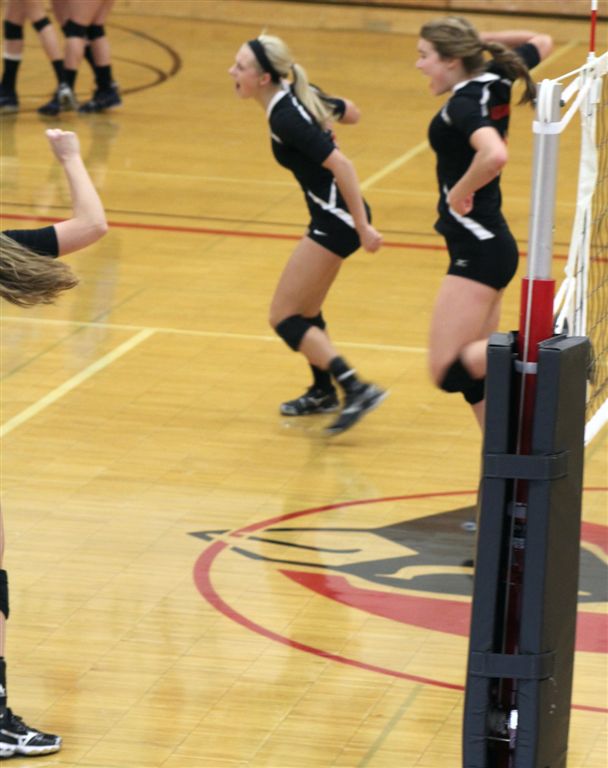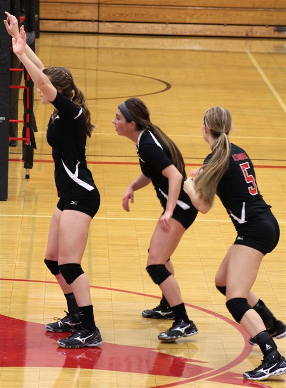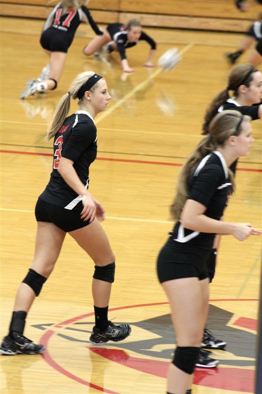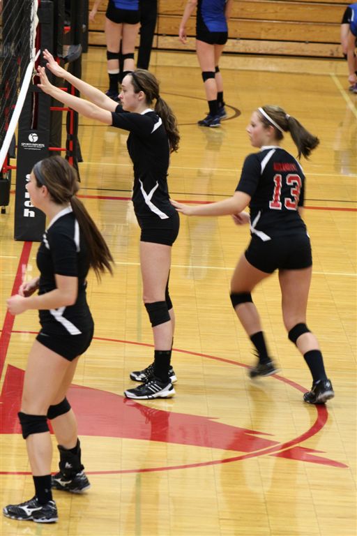 [Junior Amanda Christianson and senior Tara LeBrassuer go up for the block, Jenni’s got their backs.]