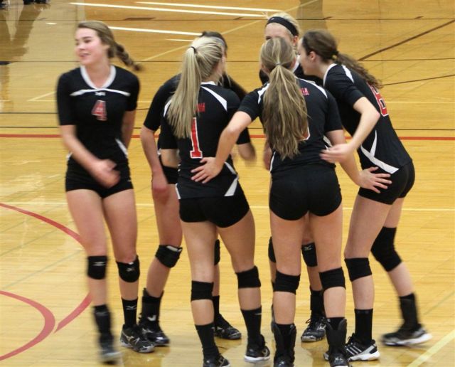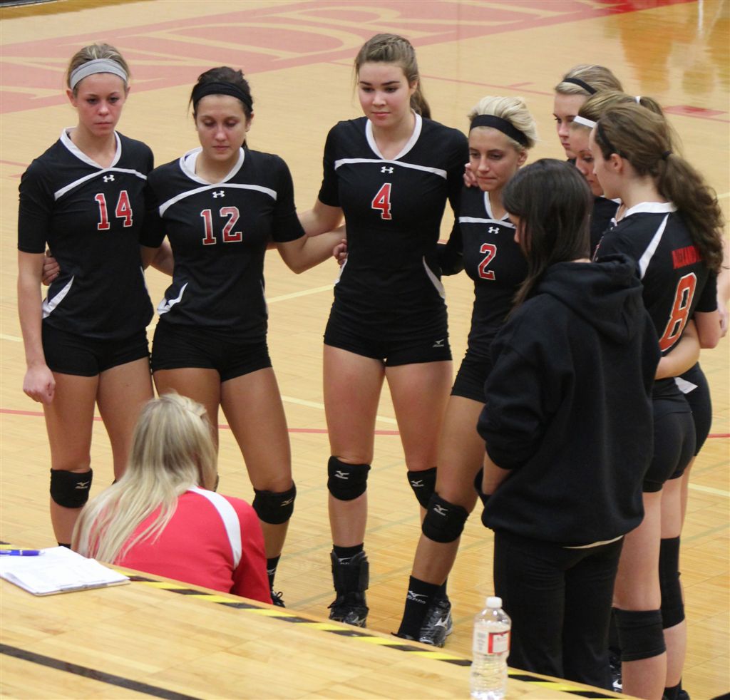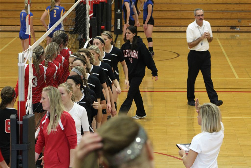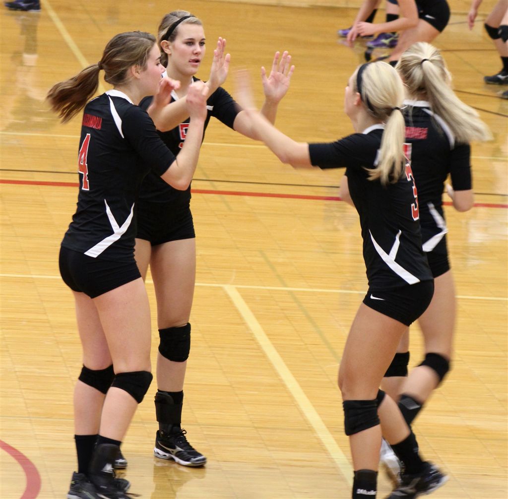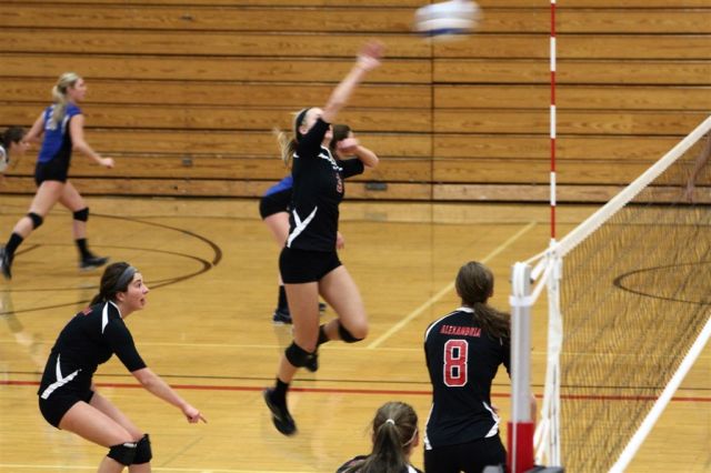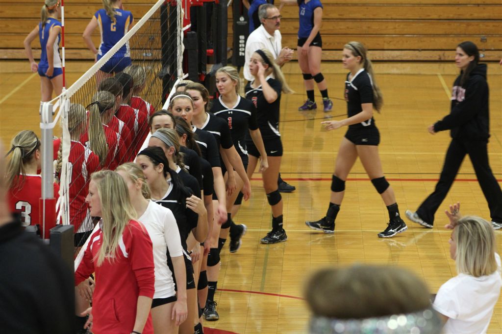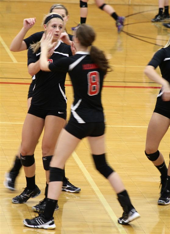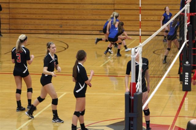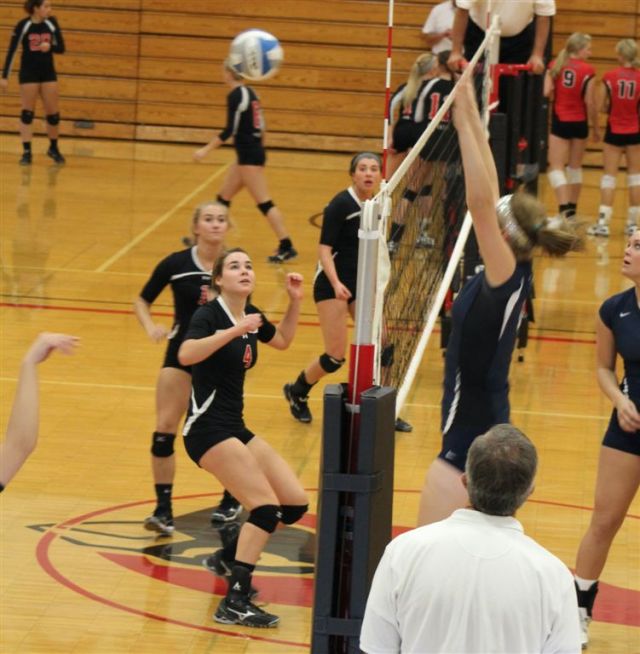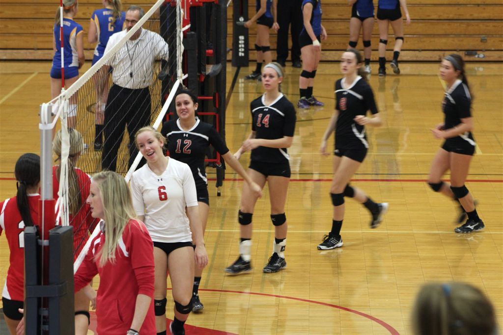 [Junior Amanda Christianson and senior Tara LeBrassuer go up for the block, Jenni’s got their backs.]