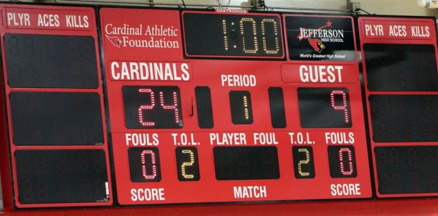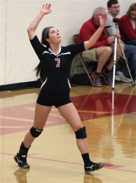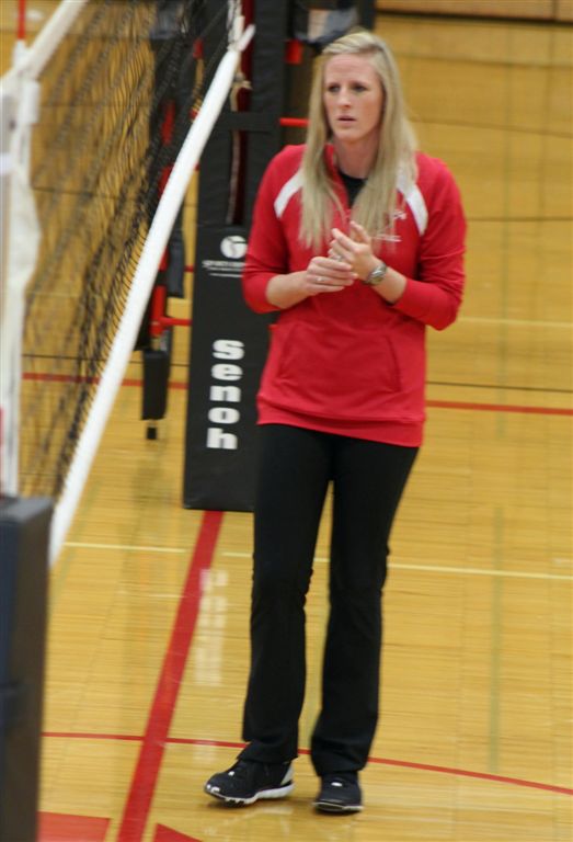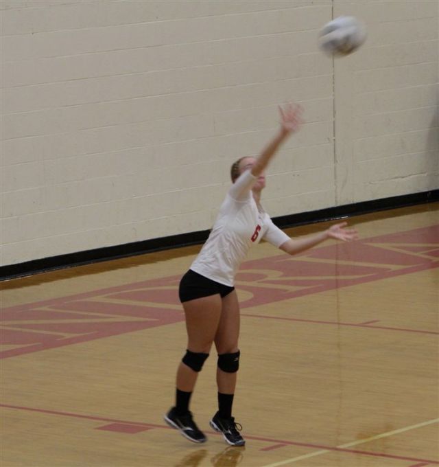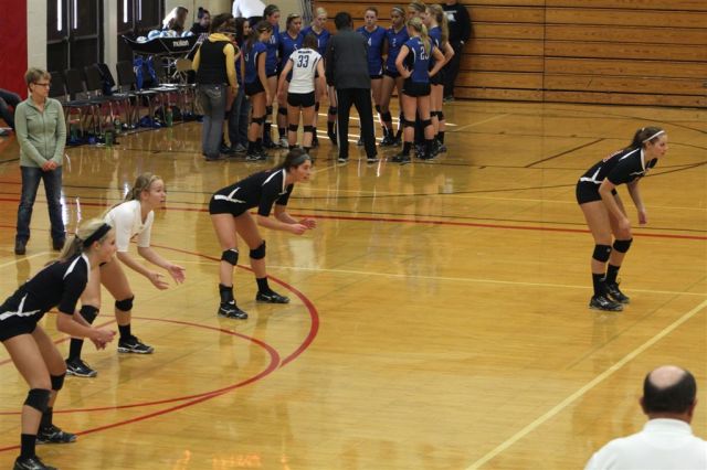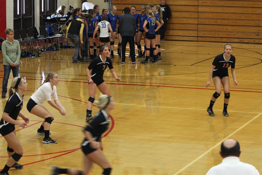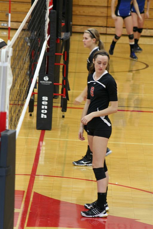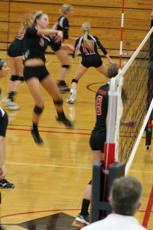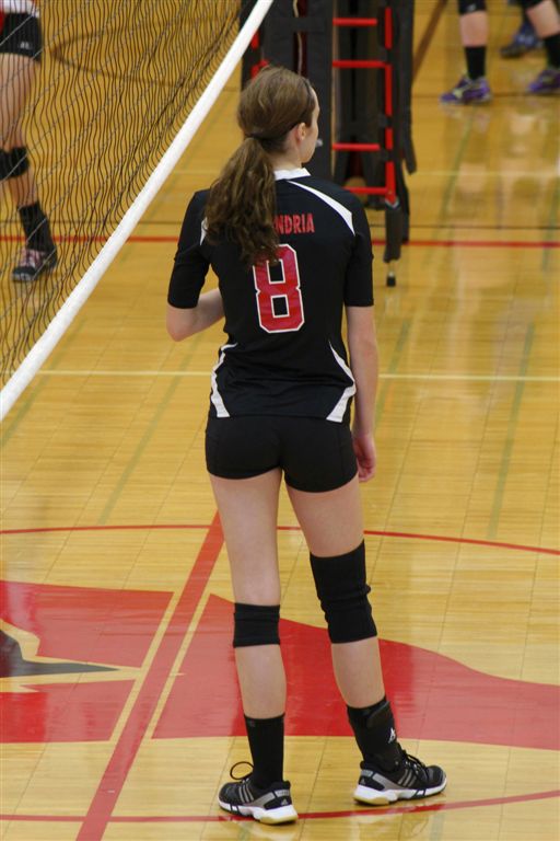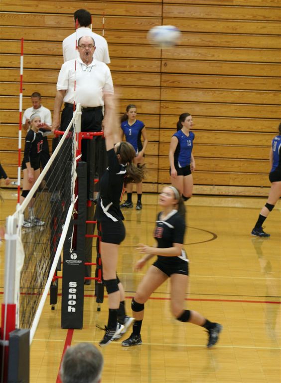 [Heifort is on the far side. But their true menace was the player in the foreground, Jessica Yost. The program listed her as 6’1″ – maybe when she was a 7th-grader! She towered over everyone else on the court. They set her well all game, and she could really bang ’em.]