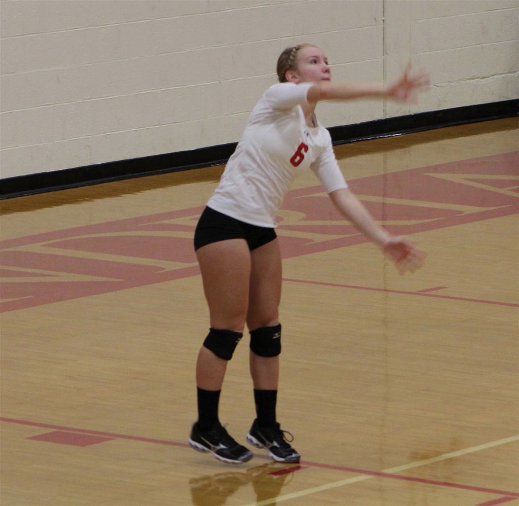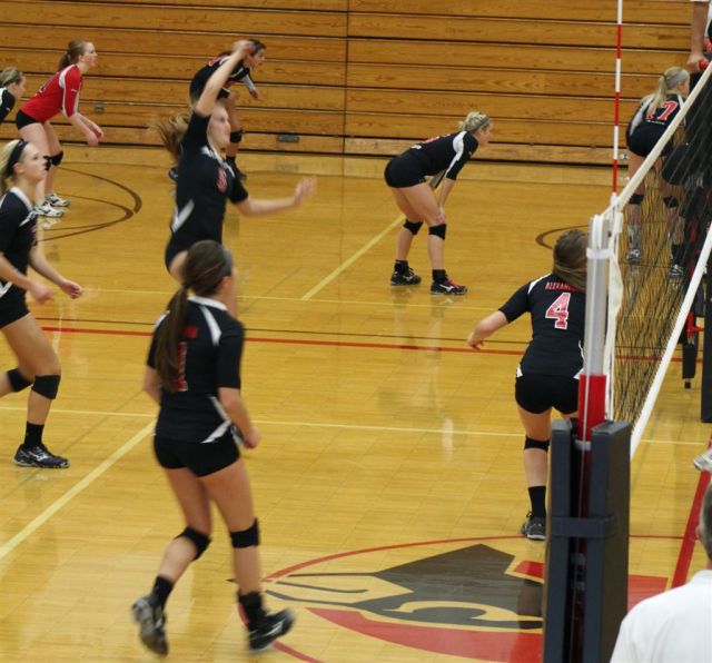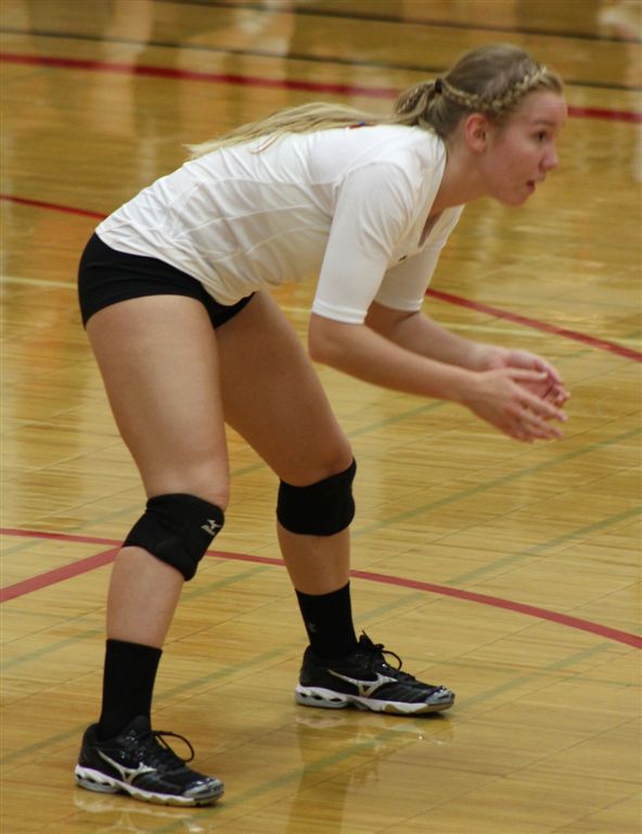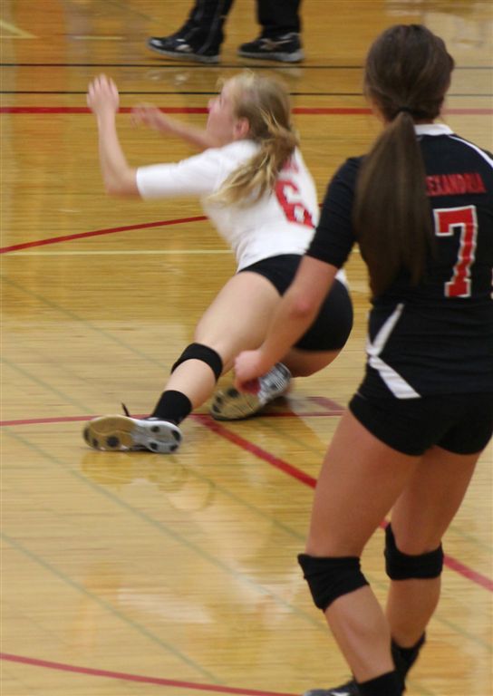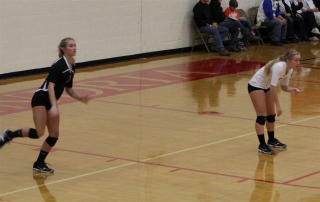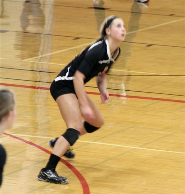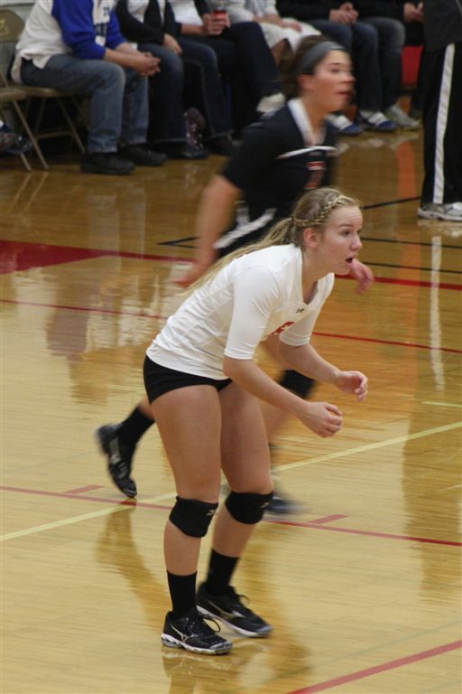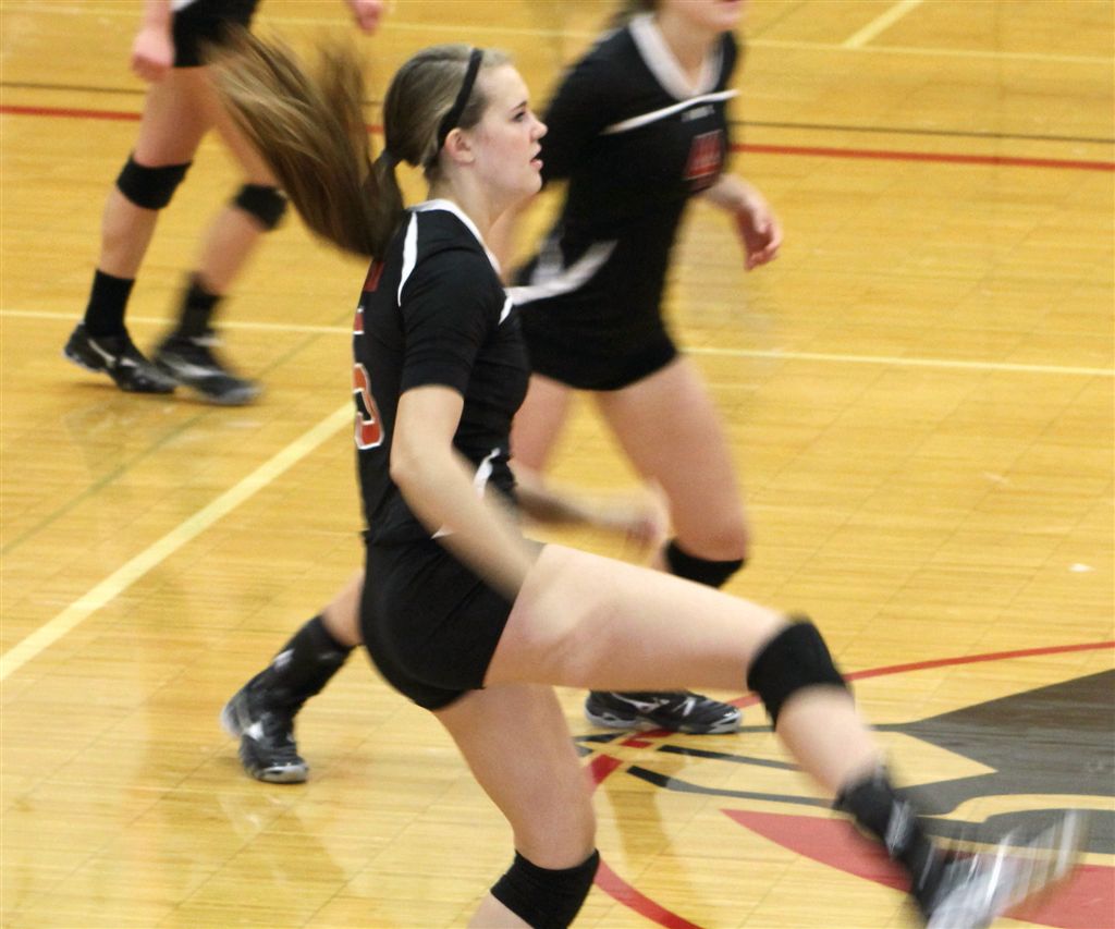 [Shanee’ gets ready for a dig, the hitters move toward the net. Brainerd in the background on the other court v. Wadena/Deer Creek.]