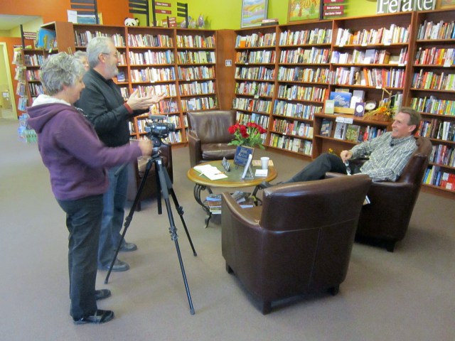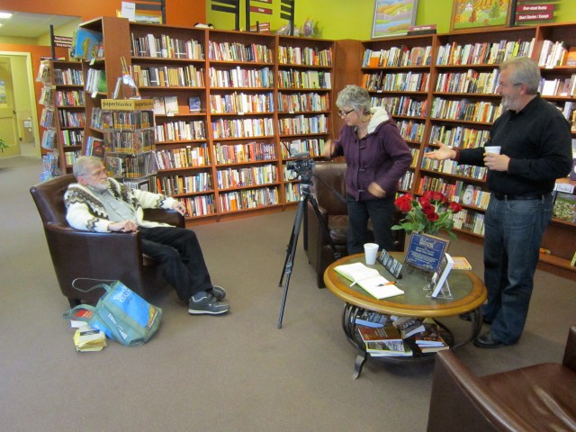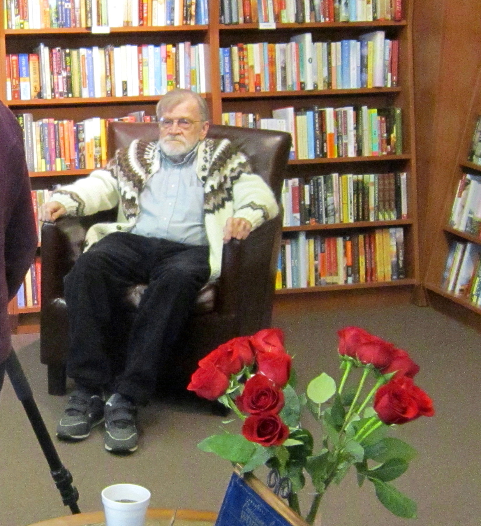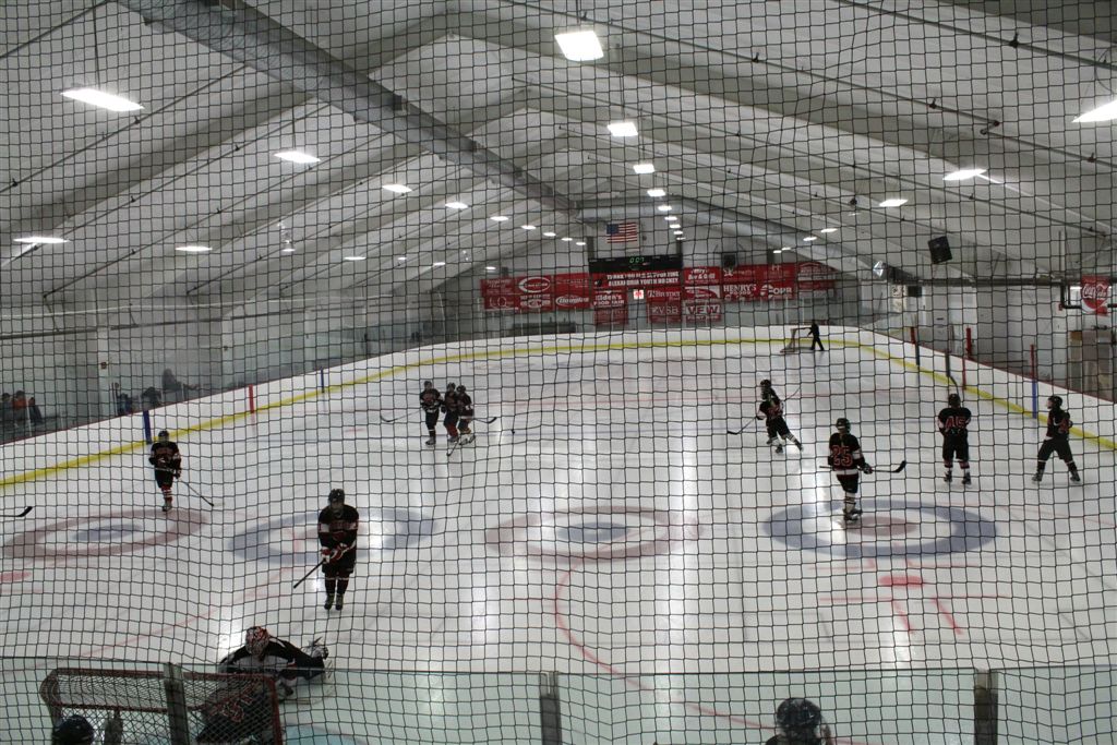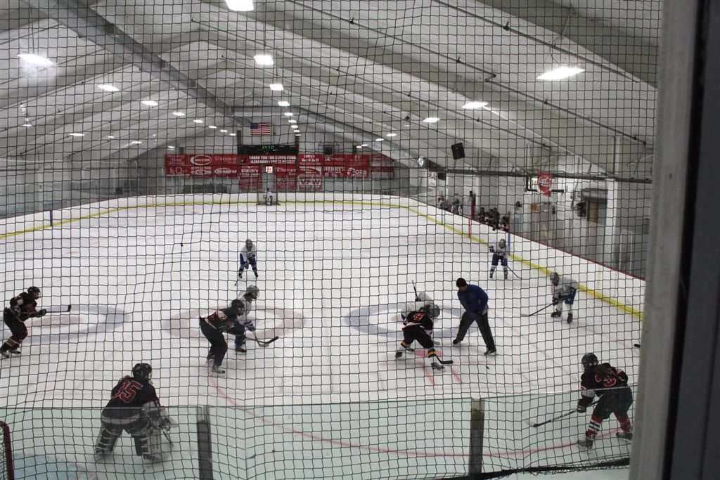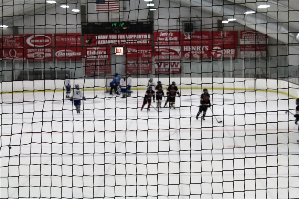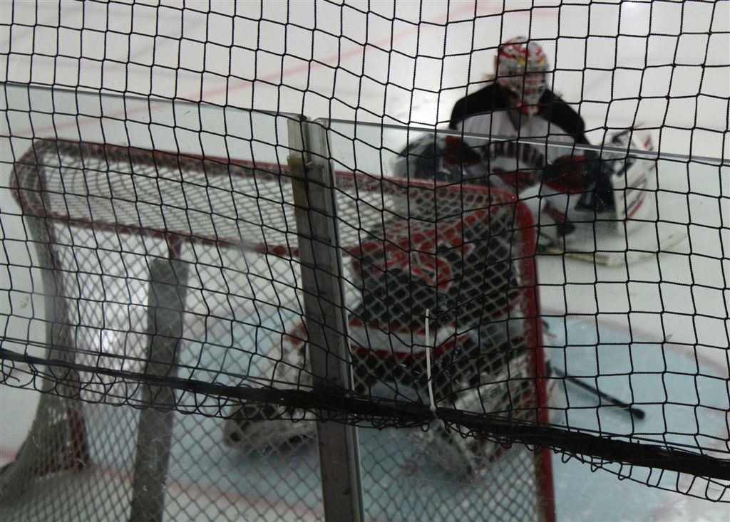 [After a meeting w/ lunch, I returned for the 3:00 game. I sat upstairs in the warming house this time because it was 32 degrees at ice level, and my blood hasn’t been winterized yet. The hockey moms had the same idea. 🙂 Of course a problem “shooting” from here is the netting (until the telephotos later).]