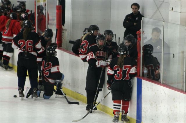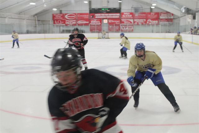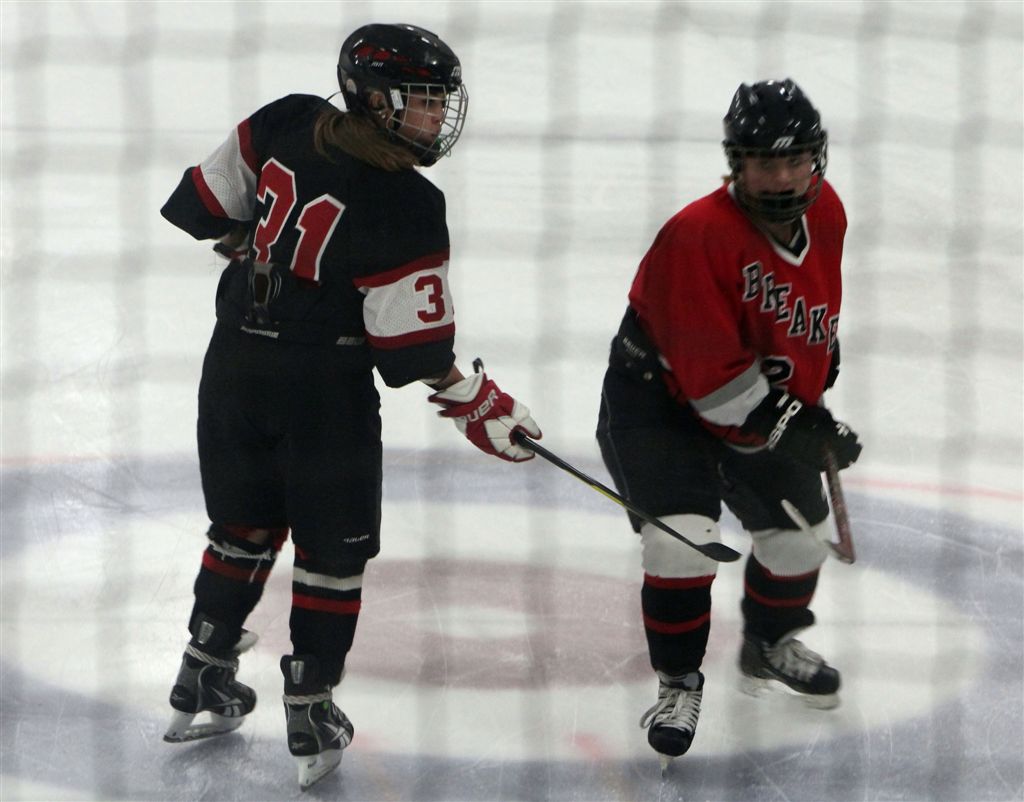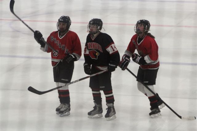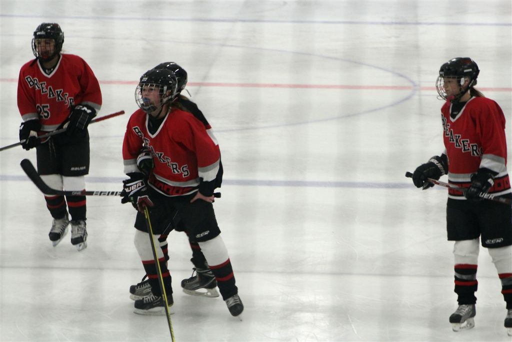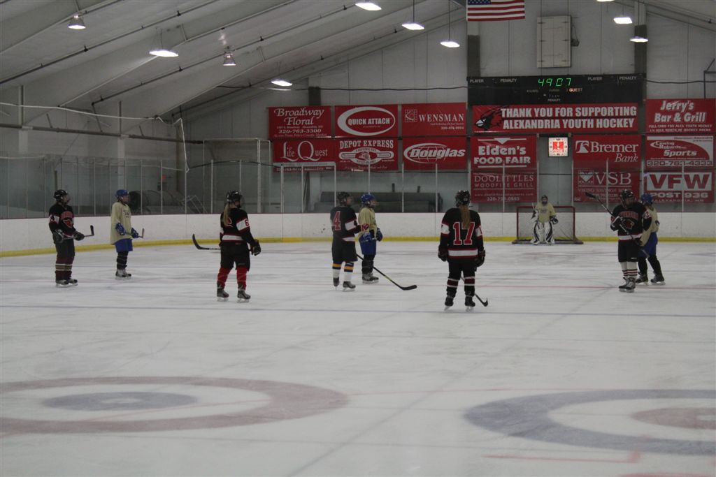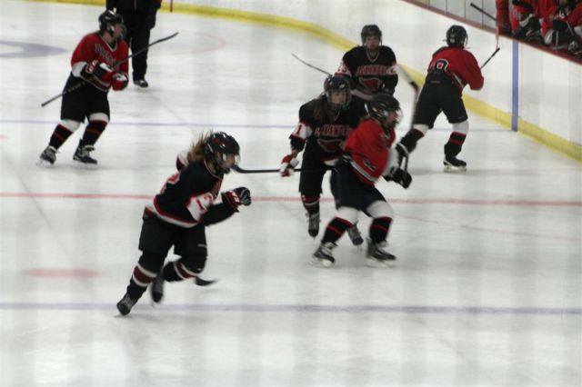 [We could recognize the “veterans.” In this shot, on the front line from l-r are seniors Madi Houska, Shelby Iverson, and Becca Illies. The defenseman on the right is Nicole Bartels, who I believe is a sophomore. 37 escapes me. We were trying to think of the other seniors – Shanee’ Herd on defense, and I believe there is one other. Danielle Carlson, I think. So we will be young but I think pretty good. Oh, Sara Schmidt, a blog favorite in the past, has decided to be a manager in her senior year.]