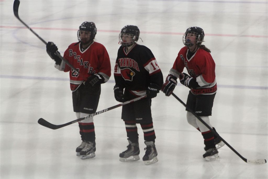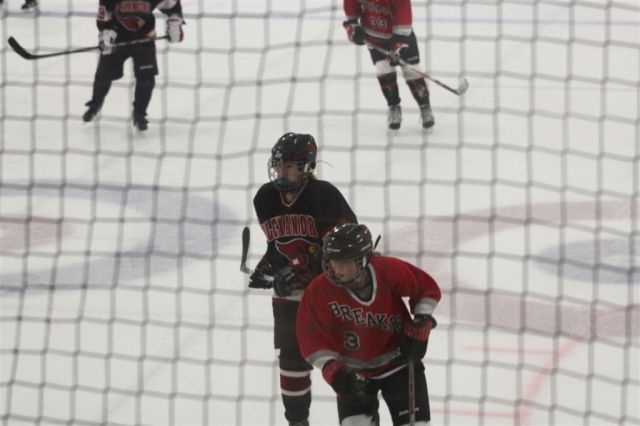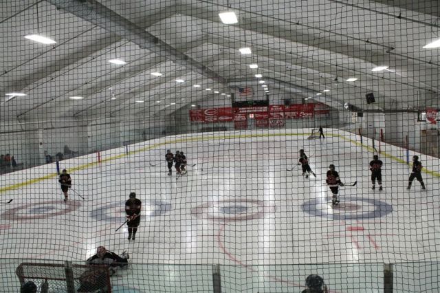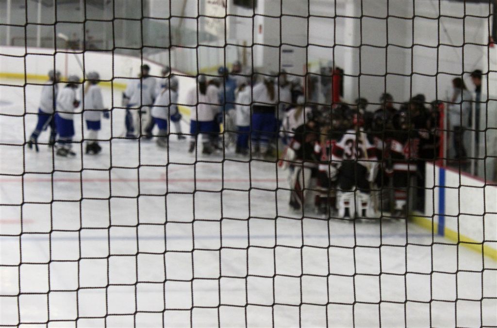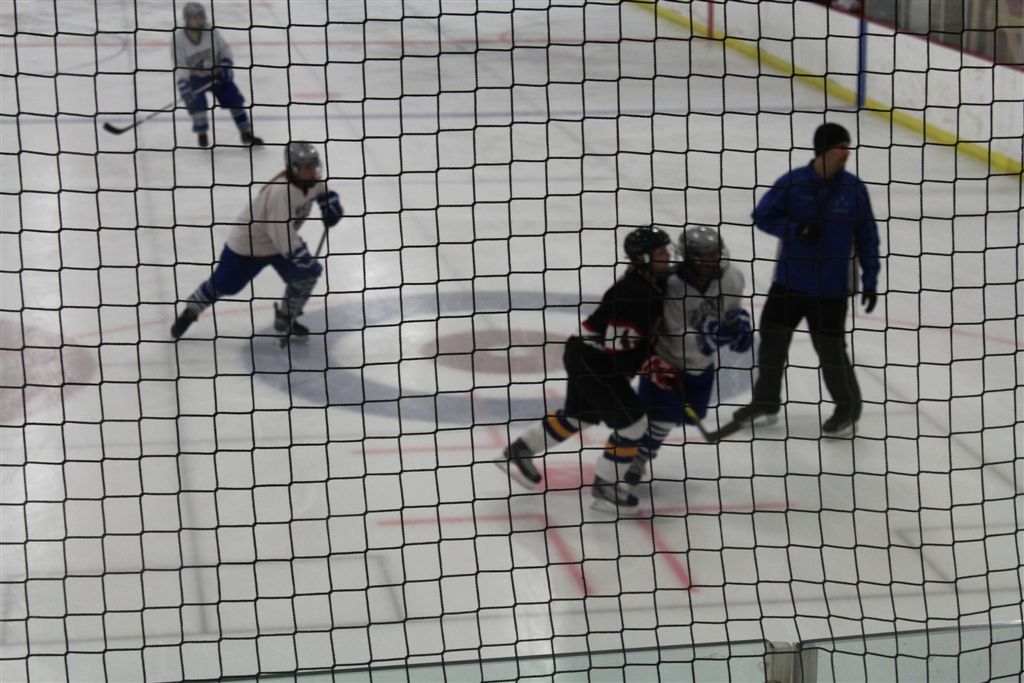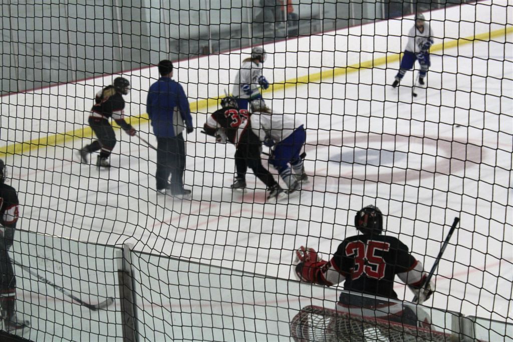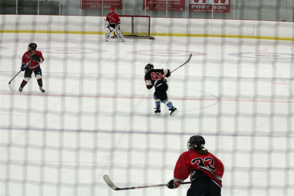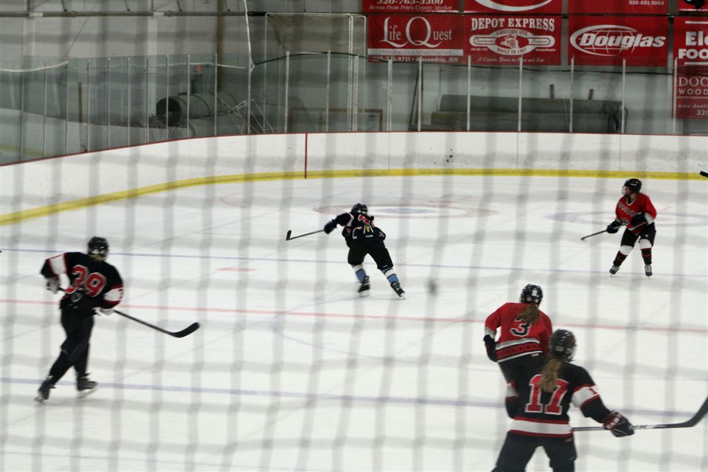 [Last game against the St. Cloud Icebreakers, which is of course a consortium from Tech, Apollo, and Cathedral. I switched to telephoto here to take the net out of play. The Icebreakers have an excellent goalie – we pelted her throughout the game. But they got one flukey goal, the only score in the game. I found out later from my source that both teams agreed to take their front line players out during the game midway – they all had to be pooped. The Cards 3rd and 4th lines kept up constant pressure and looked good! 🙂 ]