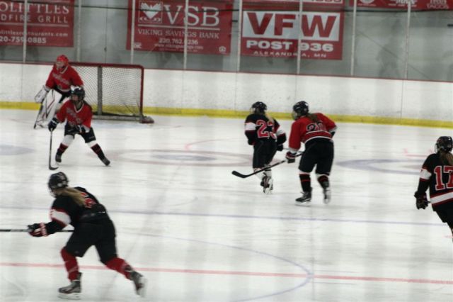 [I would guess by the bunched players this was just after a goal. Madi got the 1st goal in this game (and in game 3 v. Owatonna). The other problem as a fan for this event, the Cards were always going for the goal at the far end. It was difficult to tell who scored if it came as a result of a scrum in front of the net.]