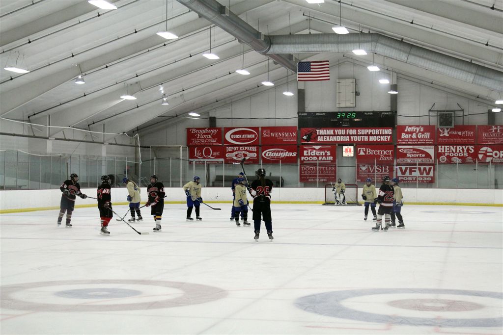 As usual, I wandered into the wrong rink. I arrived in plenty of time to set up the camera on the monopod – in the Main Rink – and sat and waited for the team to come out. A team did come out . . . and then another . . . but neither were the Cardinals? We’re the host team – I was sure this would our rink. So I gathered up my “stuff” (I need a photographer’s assistant), hustled through a phalanx of uniformed hockey players, and eventually made my way into the West rink where the Cards were already into their warm-ups. Uffda! I set up my “stuff” again and began the video. As I stood there, camera steadily ensconced on its perch, I looked around and discovered Dan Kopischke (father of Alia, from last year’s team), who had the good sense to pick up a schedule on his way in. The schedule reported the teams were St. Cloud, Owatonna, St. Cloud, and River Lakes. It was a round robin event – everybody played everybody else. But the Cards played all their games in the West rink (limited stands, much colder than the Main rink.) Games started on the hour from 10:00 am to 4:00 pm, each game lasting an hour on running time. The Cards, and so I supppose all the teams, have only been practicing for a week – this was like a conditioning marathon!