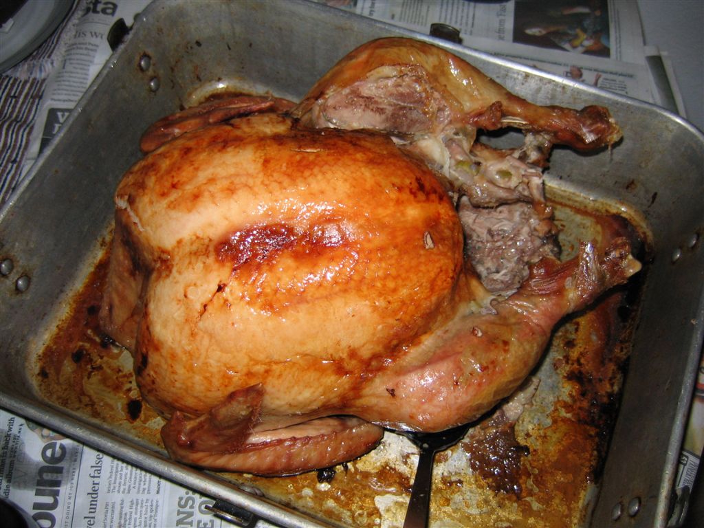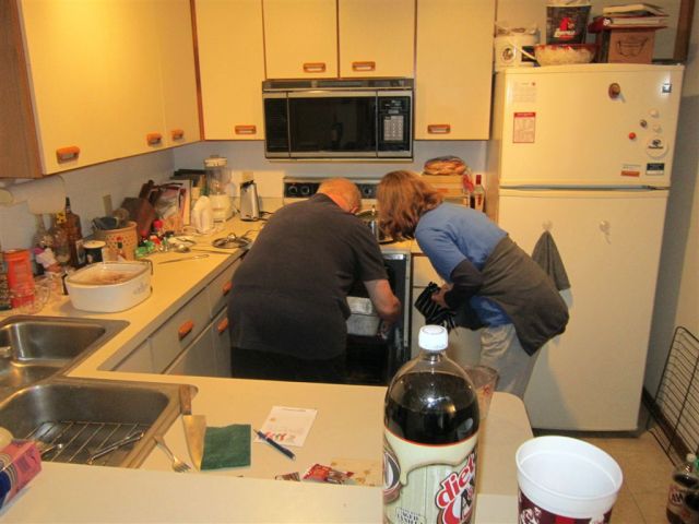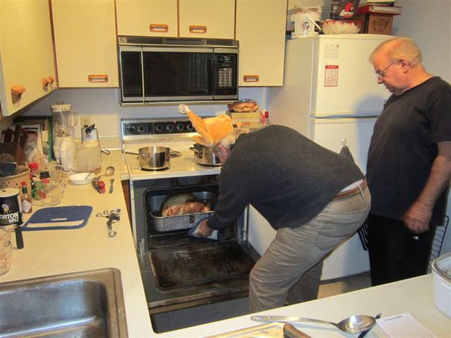 [Hans checks the bird. Dan puts the 25-pounder in about 6:30 am each year. To our knowledge, it’s only day of the year this night owl arises before 10:00.]