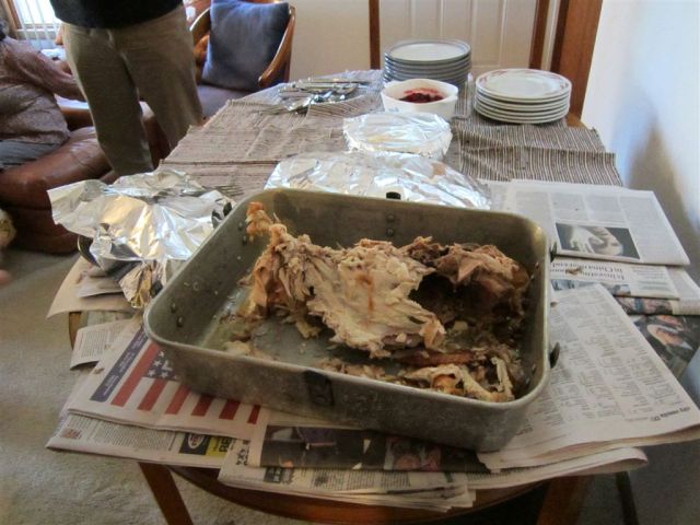 [Clean-up begins! The supervisor gets the carcass every year. By the very next day we were enjoying turkey vegetable soup.]