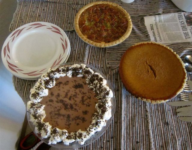 [We must have eaten already – here come the pies! And there was a 2nd pumpkin pie! 🙂 In addition the turkey, The Great One’s annual specialties include mashed potatoes and gravy (of course), sweet potatoes, two kinds of cranberries, three kinds of dressing, and baked corn. No one went home hungry. (Thank goodness, because I never noticed the Albany DQ on the way home!)]