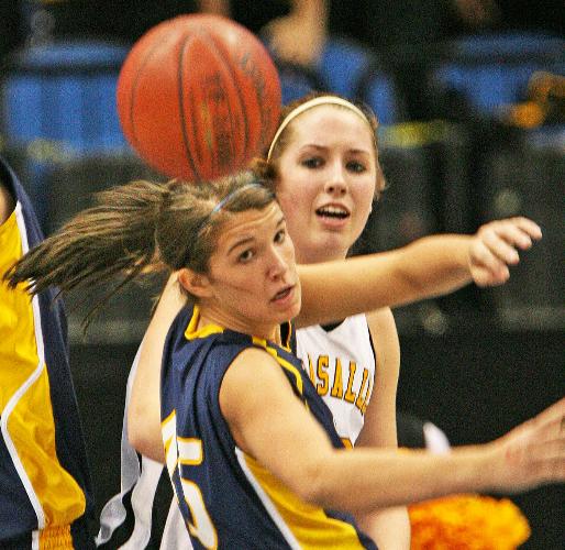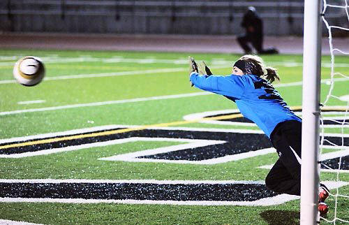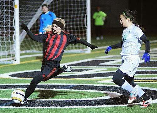 [Sarah Bruzek, above, and Becca Illies, below, in the state soccer tournament on October 25 (Echo photos).]