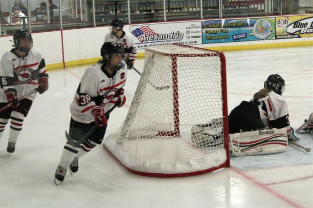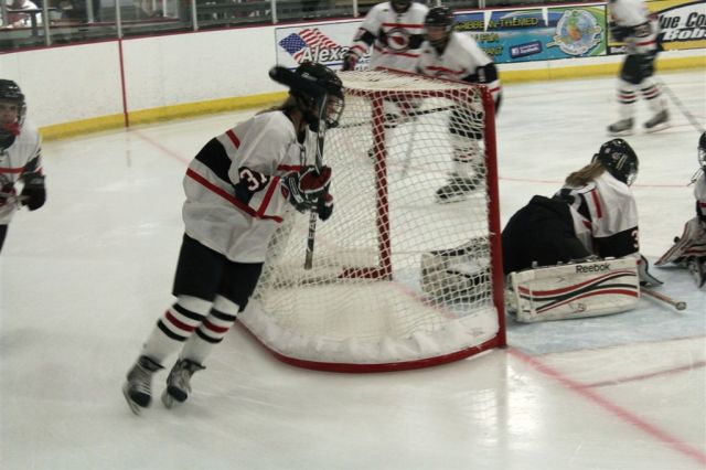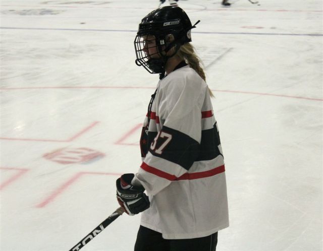 [I stood behind the net during warm-ups and tried to get as many players as I could while they were circling. This is McKenzie Revering (29), an 8th-grade defenseman. An 8th-grader, for Pete’s sake! When I was in 8th grade I was still putting my underwear on either backwards or inside-out about half the time. And she’s good, one of the 4 regular defenseman when they just decide to play 4.]