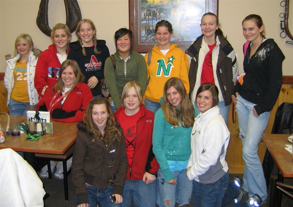 So, regarding the above photos. Our 2006-2007 hockey team. We took them to dinner at the Pizza Ranch – probably in violation of a dozen NCAA rules. Danielle was the Roadblock goalie, Abby was the leading scorer. They are all growed [sic] up now and can legally drink adult beverages. Makes me feel older than I am (if that’s possible). We heard from Roadblock’s mom this morning about being featured in the blog yesterday – I told her today Danielle would be leading us off. Beth Rindy, standing 3rd from the left, is a junior at Bemidji State, was home for the Cardinals game on Tuesday.