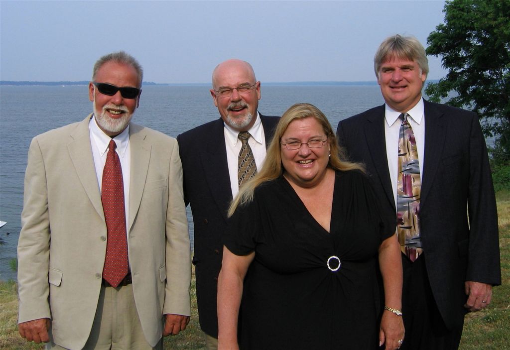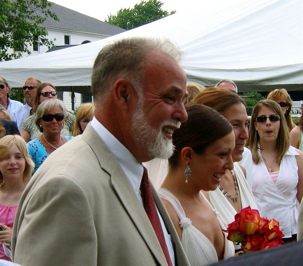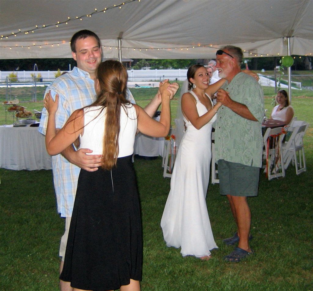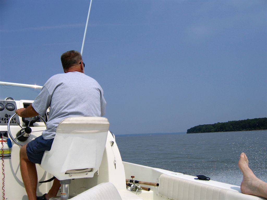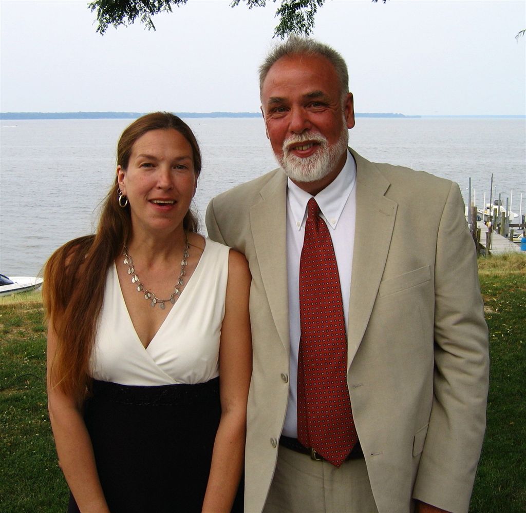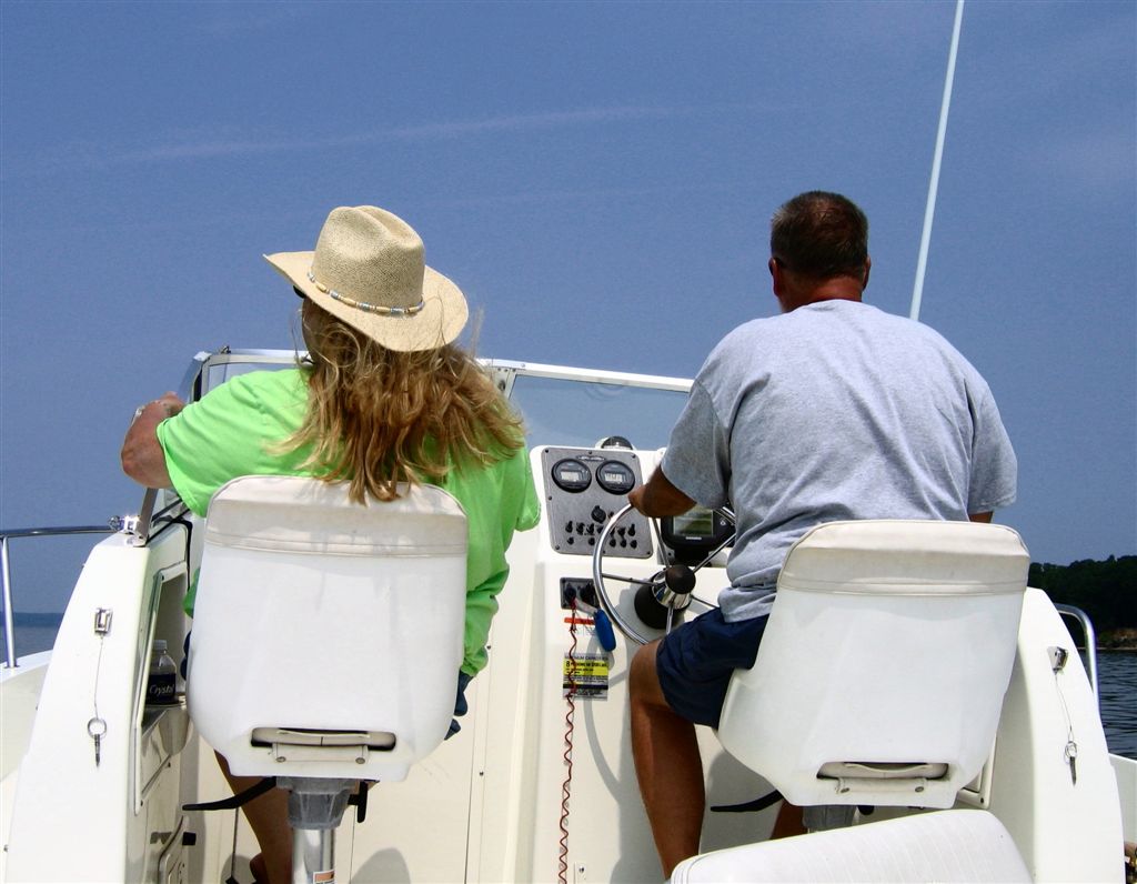 [Hey, how ’bout another family wedding? It’s 2007 and we’re in Stafford, Virginia, home of brother Chris and sister-in-law Janet. Their daughter, a/k/a, our niece, Jessica, was getting married. It was a hot today (see the photo at the top of the previous post – it was 100 degrees at their place). They live on the Potomac River, and Chris took us for a ride in his Boston Whaler. Sister Gretchen is his co-pilot here.]