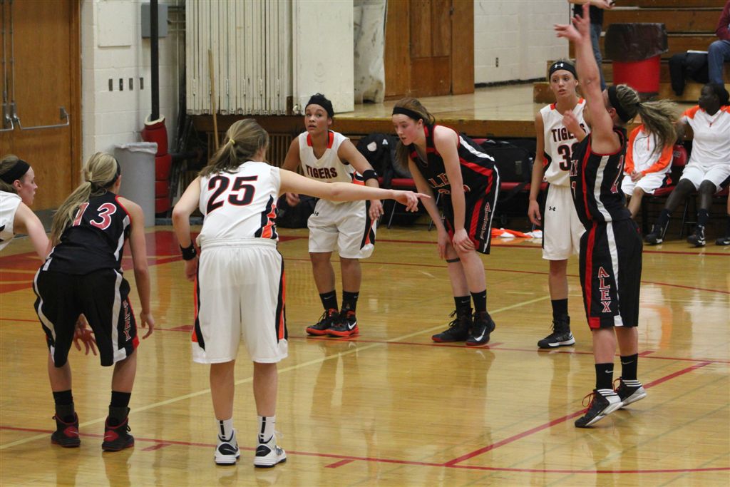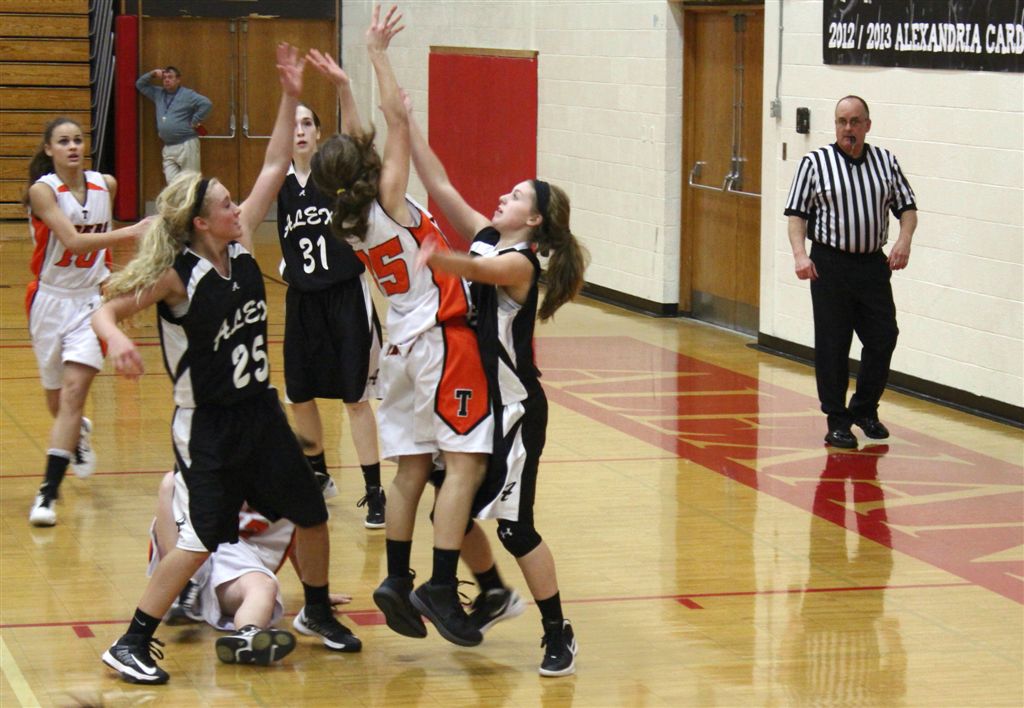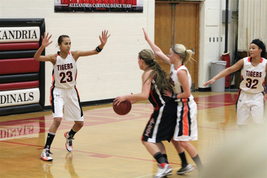 [Amanda C and Emily Thul (3) play alley-oop over a Tiger.]