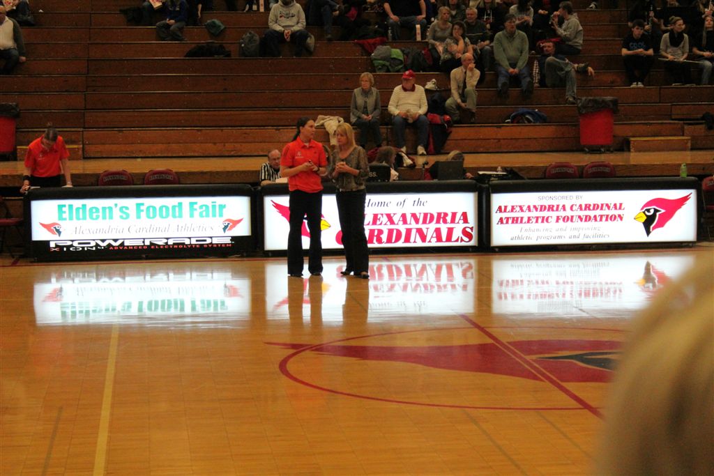 [Pre-game coach’s visit. A shout-out to Kohler for her Breaking Barriers award from the Minnesota Coalition of Women in Athletic Leadership. She was selected to the Minnesota Basketball Coaches Association Hall of Fame in 2003, has led the Cards 7 state tournament appearances including the championship in 1997, and has over 450 vistories in 27 years of coaching (really? impossible!). 🙂 ]