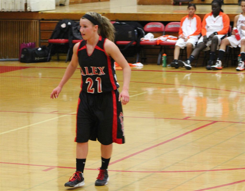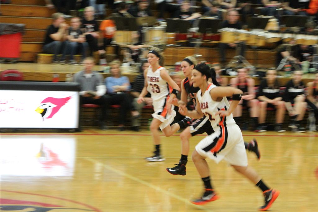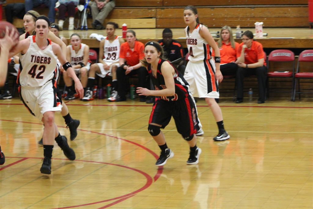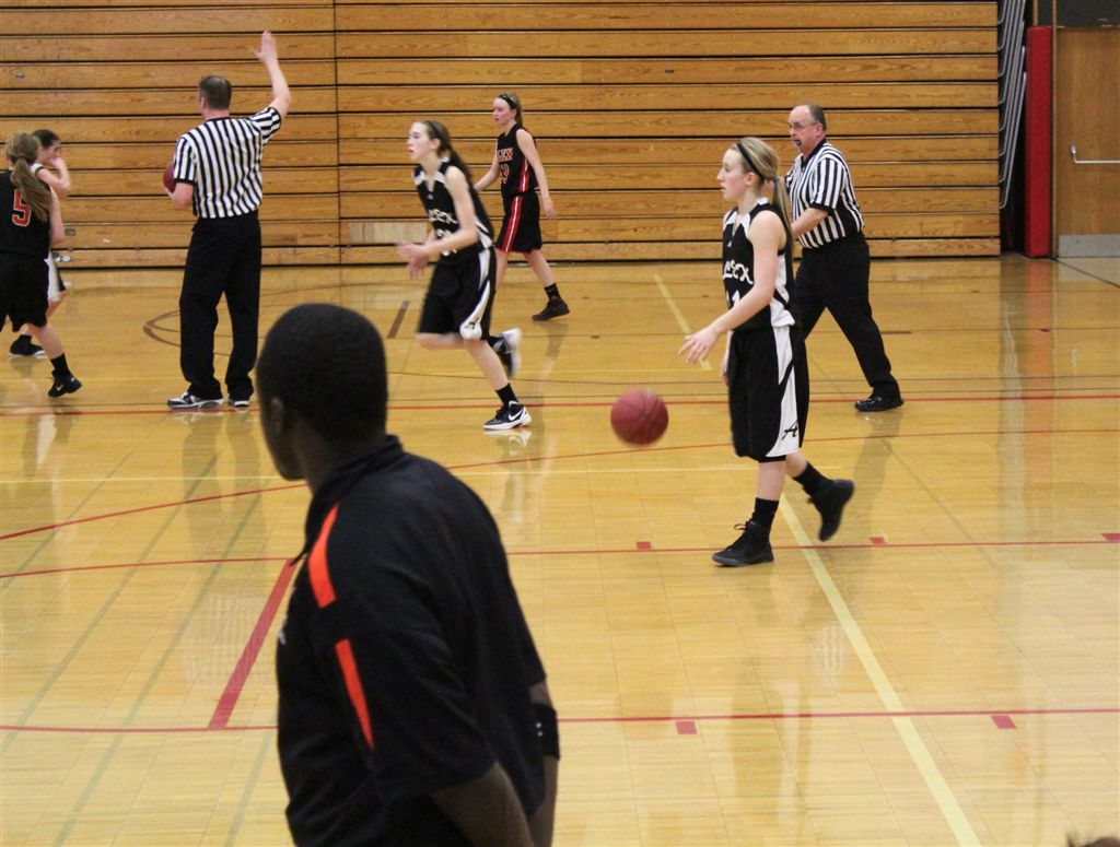 [Ms. Revering attempts a free one. That appears to be Carli Dropik (5), sophomore, on the left lane – she was impressive in this game with her ability to get out and go.]