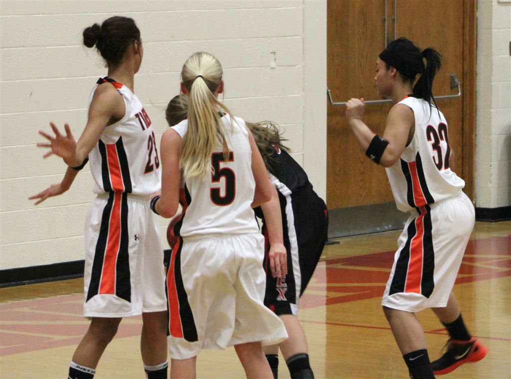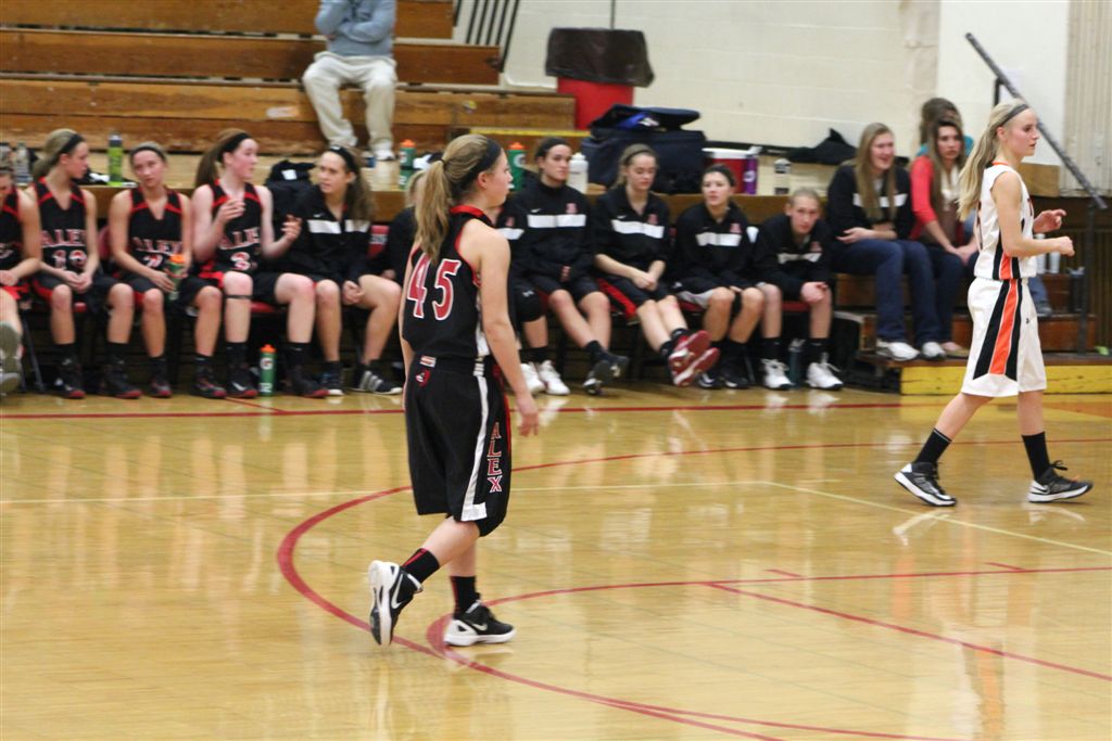 [There was no sign of life on the court when I arrived. I thought maybe the game had been called because of a slaughter rule or something? Eventually the two teams meandered back on to the court. I’m going to assume the Cards applied great and continuous pressure in the 1st half to build such a commanding lead. The 2nd half was better balanced with all the Baby Birds getting plenty of playing time. Here we have three of the players responsible for the big lead – Jaylen Olson-Rodel (25), junior; Alyssa Freiderich (31), junior; and Kendall Kohler (45), 8th grade.]