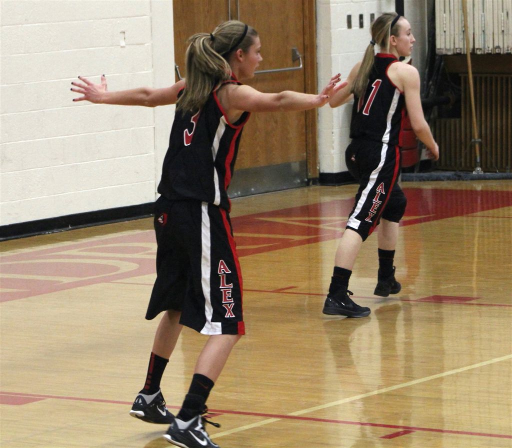 [Jaylen, Heather Johnson (15), sophomore, and Natalie Amundson (13), sophomore, on defense.]