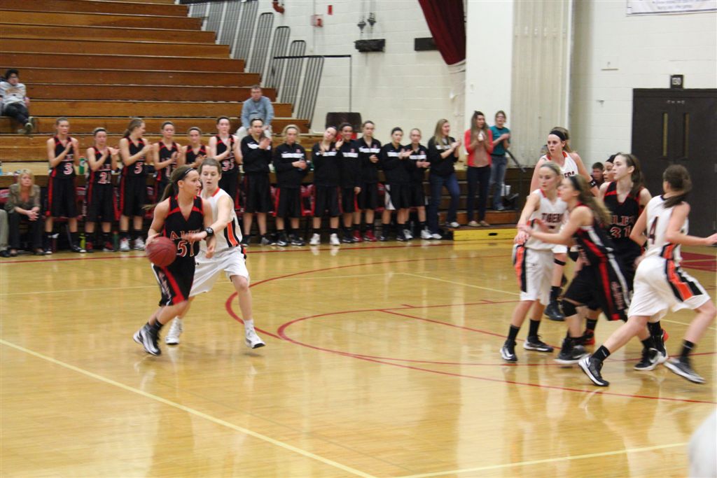 [Macy Hatlestad (11), 8th grade, walks the ball upcourt. The Tech coach is in the foreground undoubtedly wondering who is this wunderkind?]