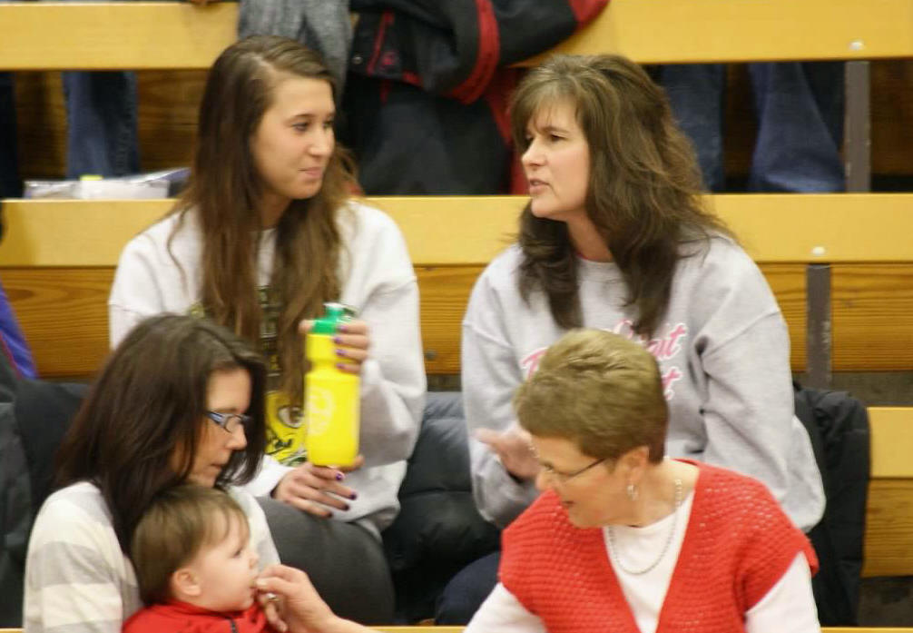 [Amanda C greets a St. Cloud Tech Tiger. In the background, you can see Cardinal basketball players of the future, as well as those from the past, if there had been a Title IX at the time! It’s nice to see multi-generational fandom. 🙂 ]