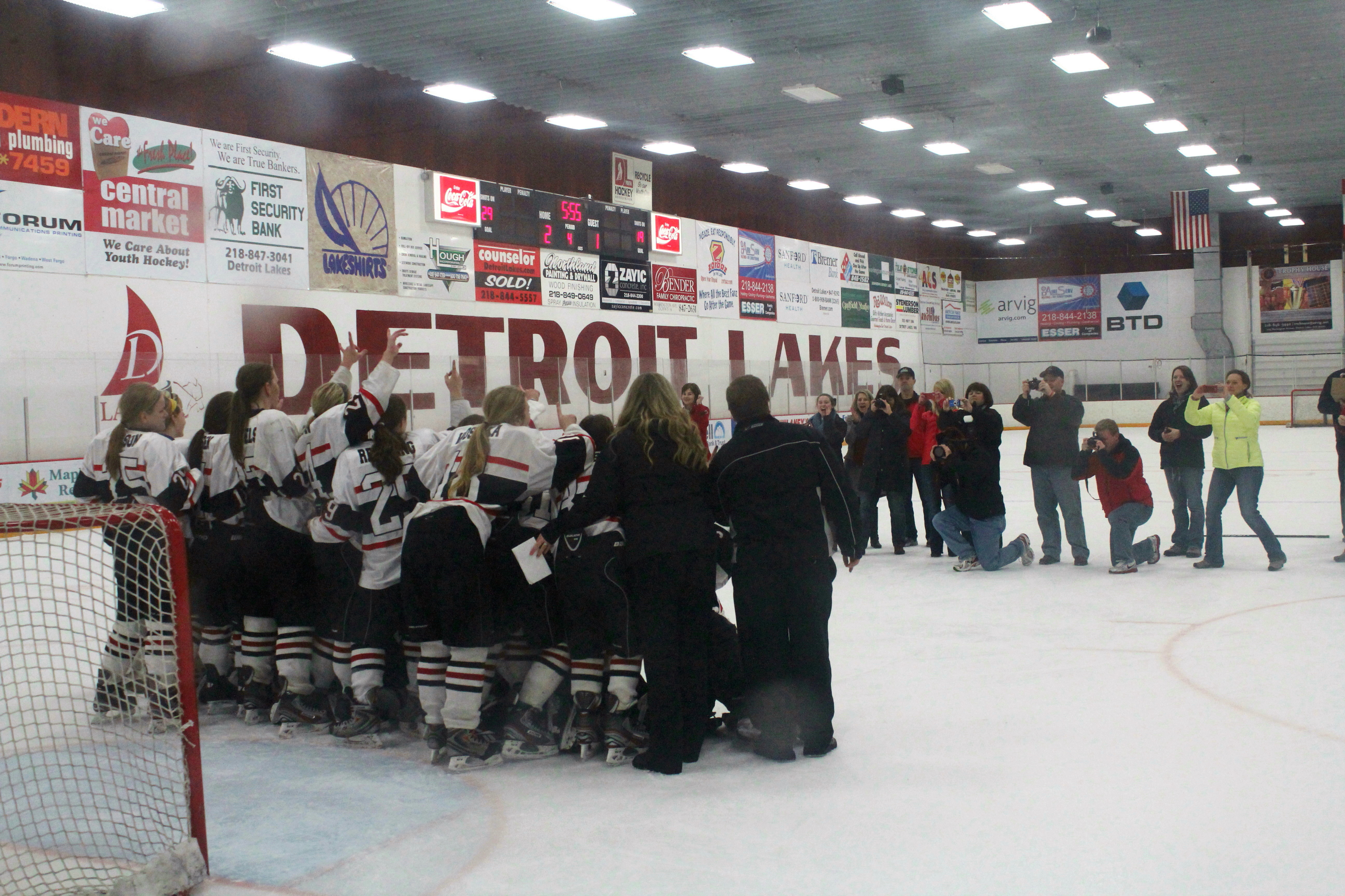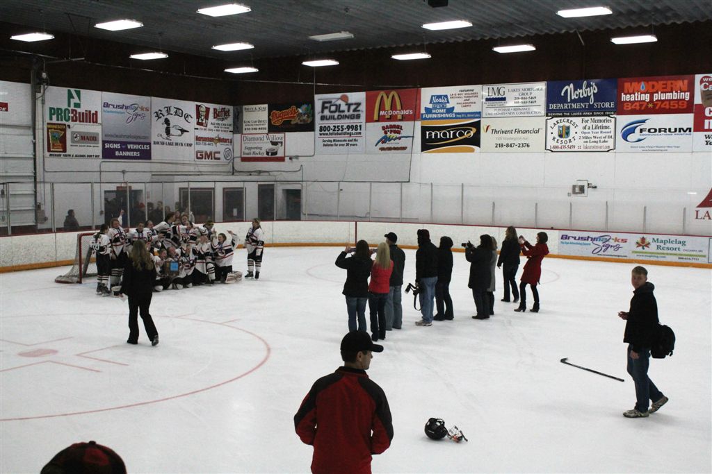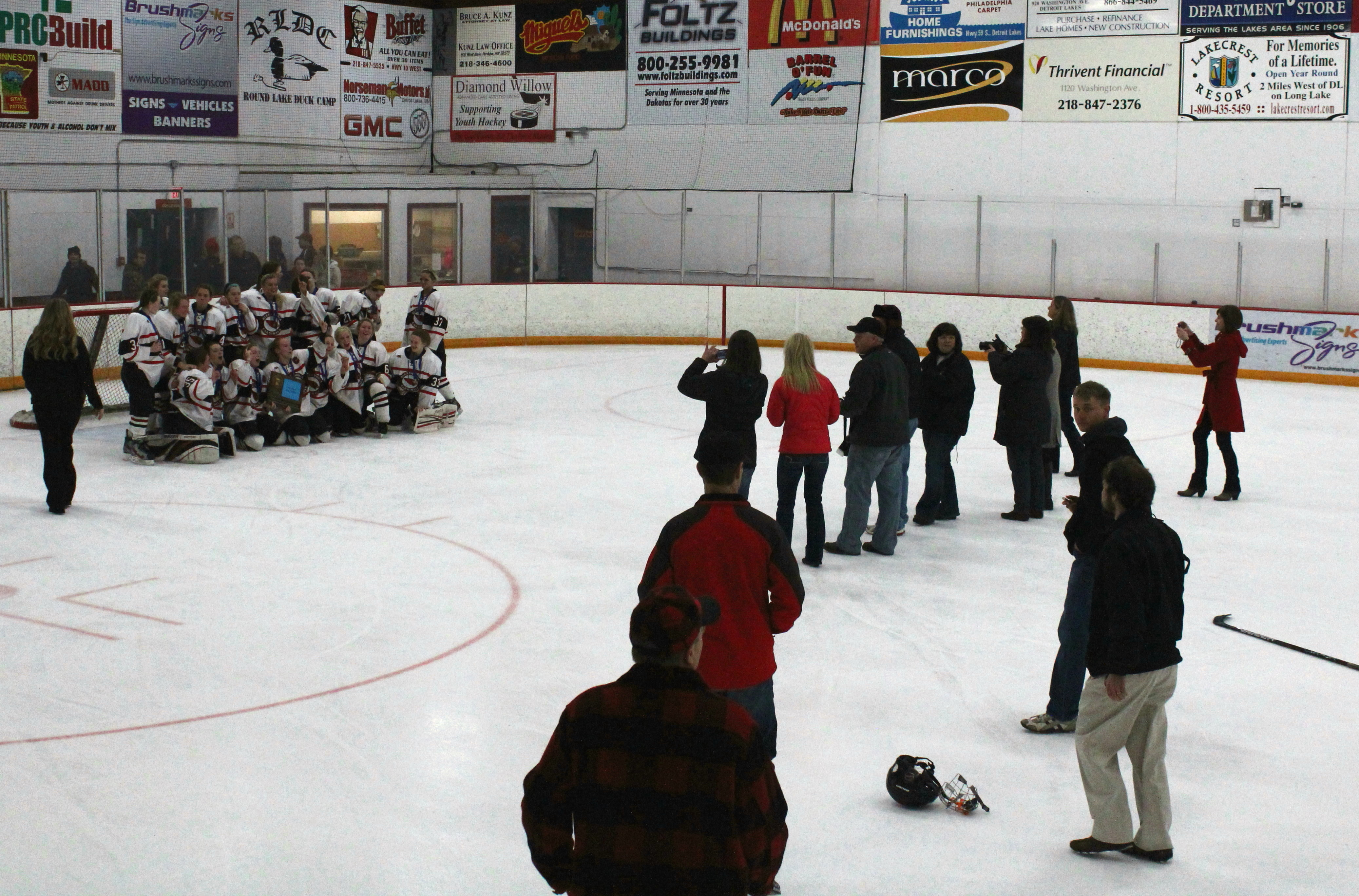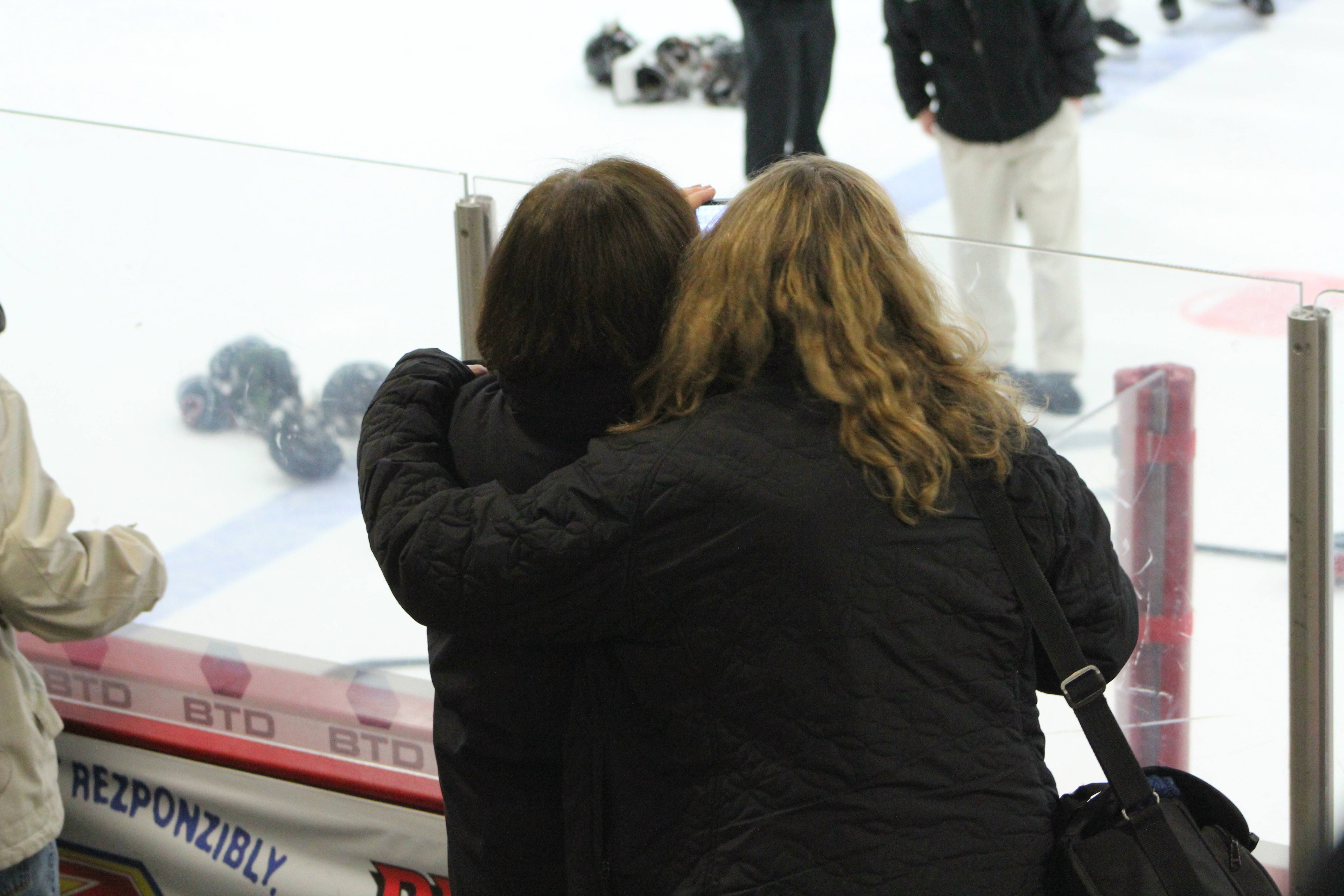 [Hockey moms, Shanee’s and Becca’s, rush the ice for photo ops.]