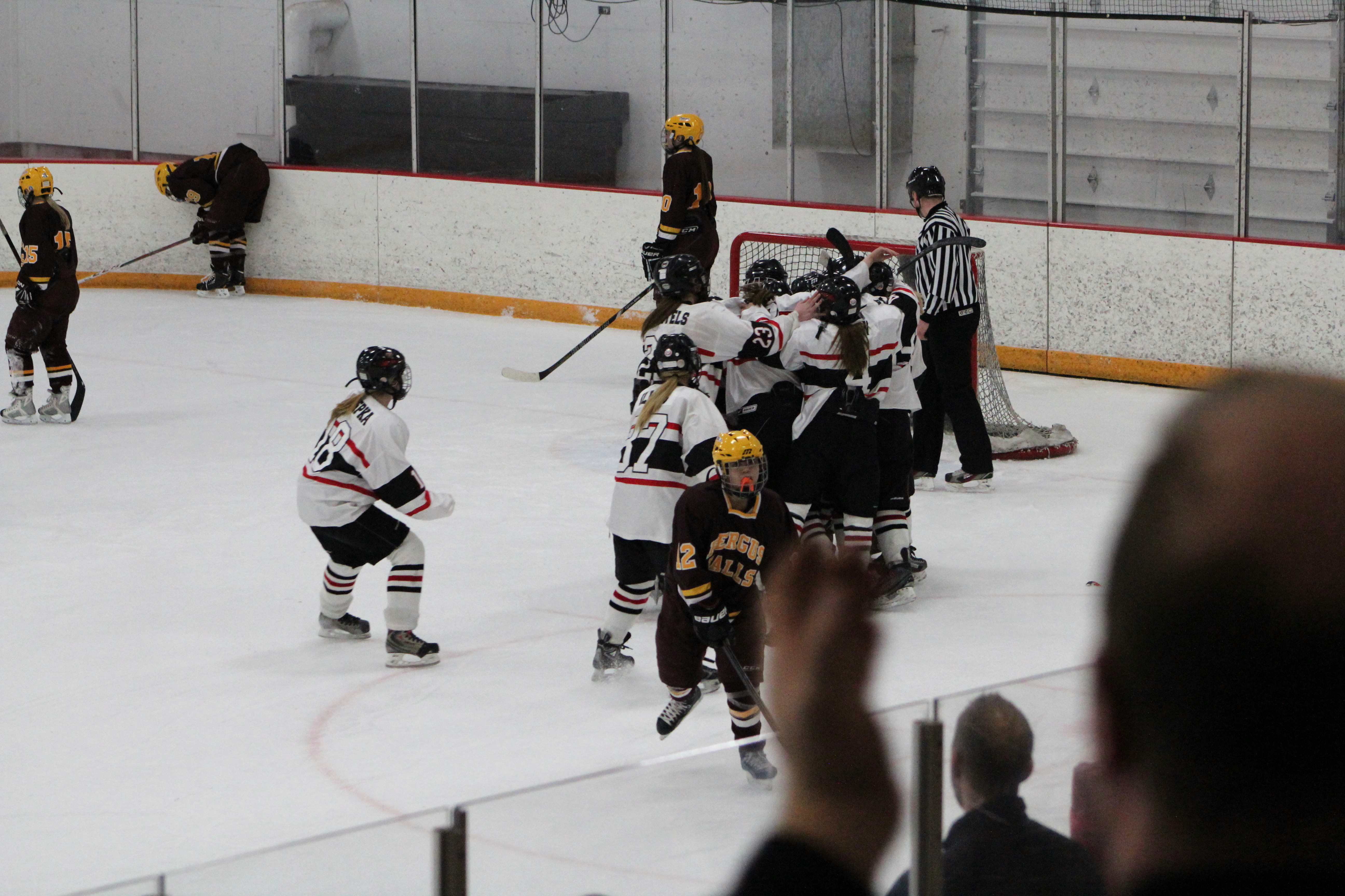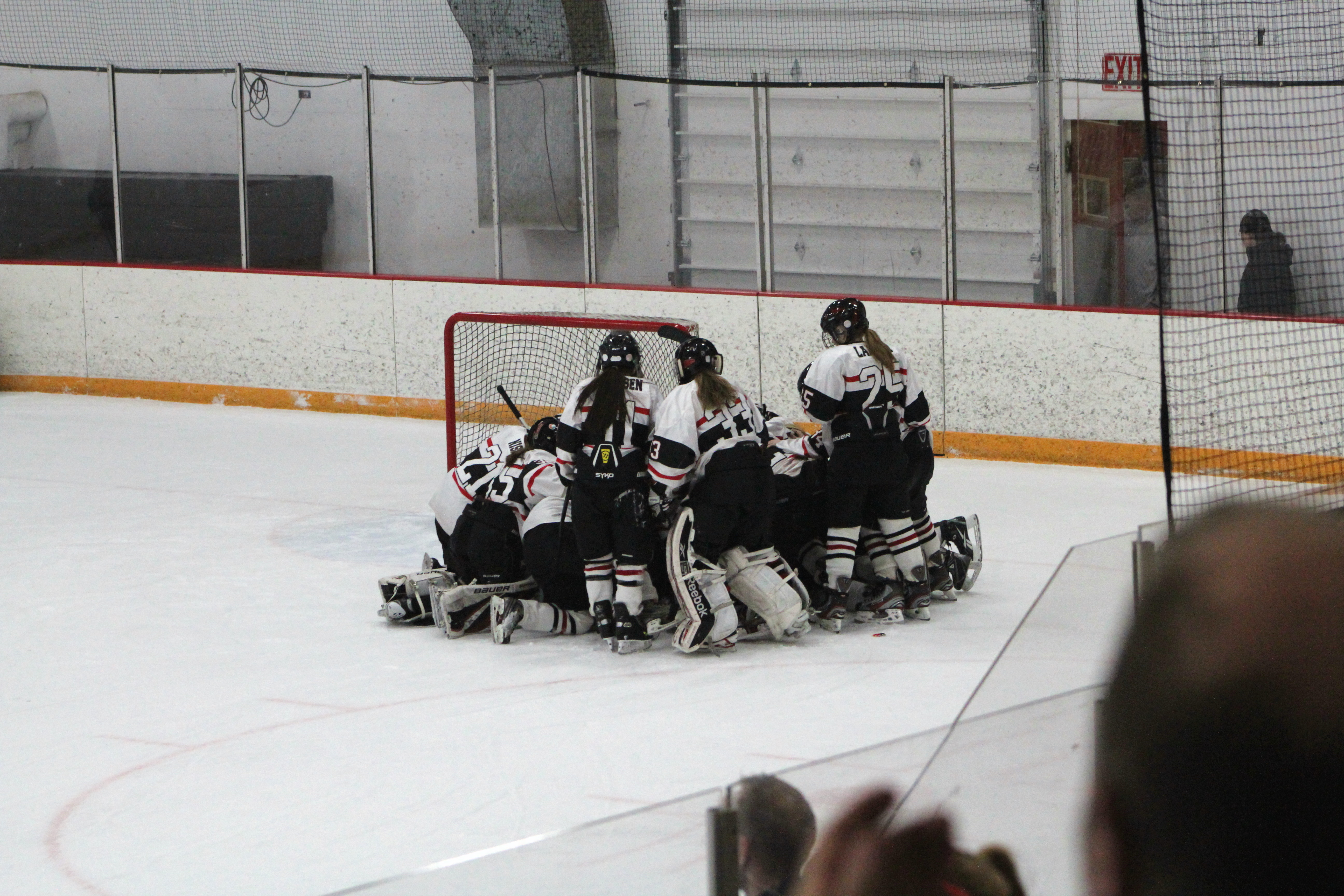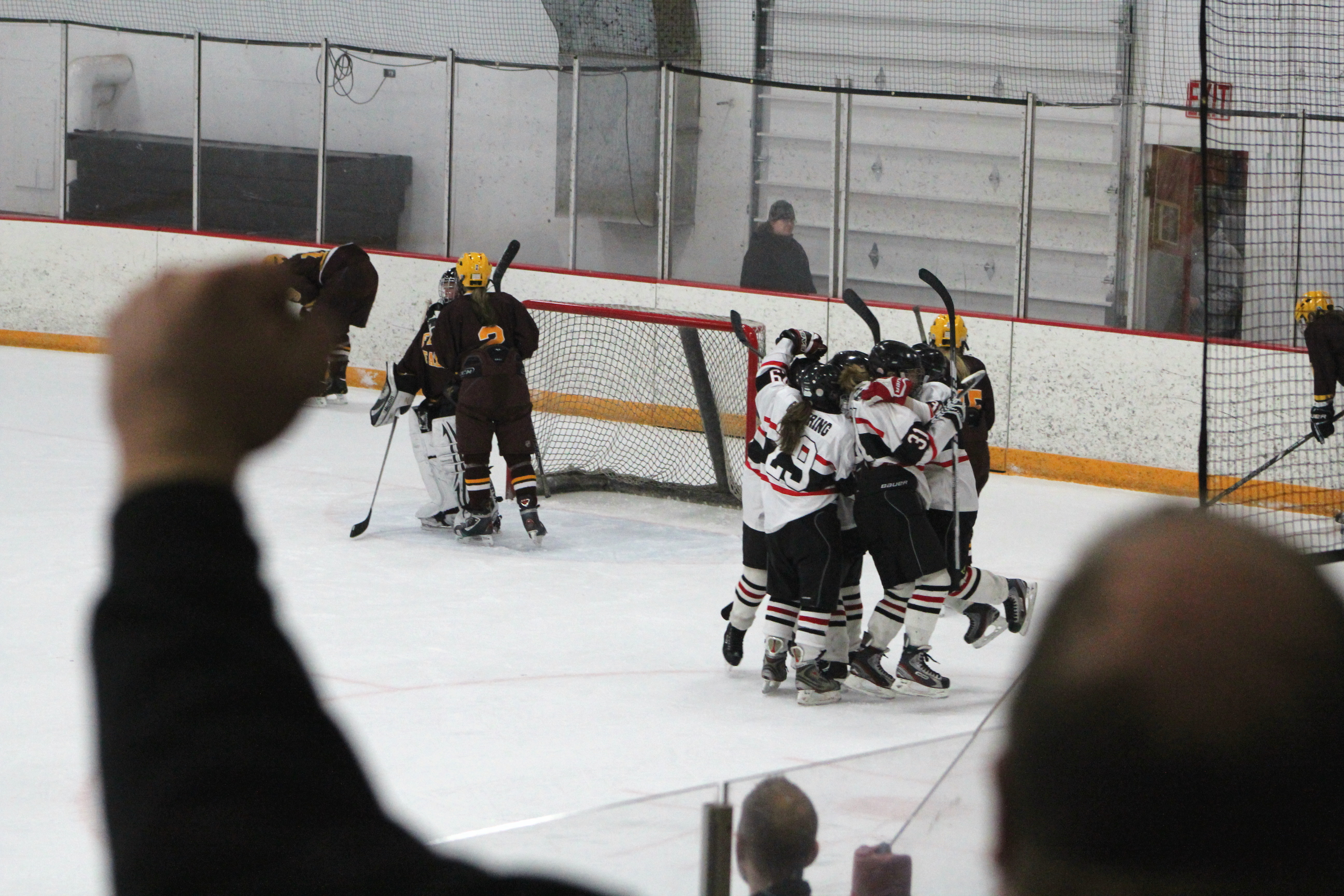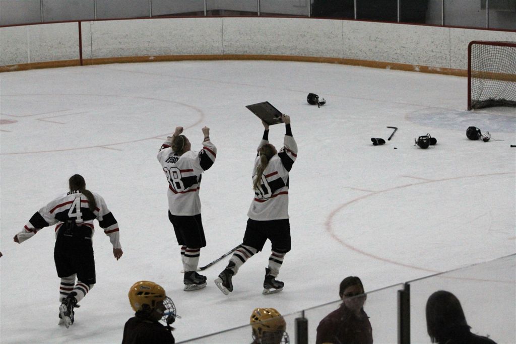 [Hockey moms, Shanee’s and Becca’s, rush the ice for photo ops.]