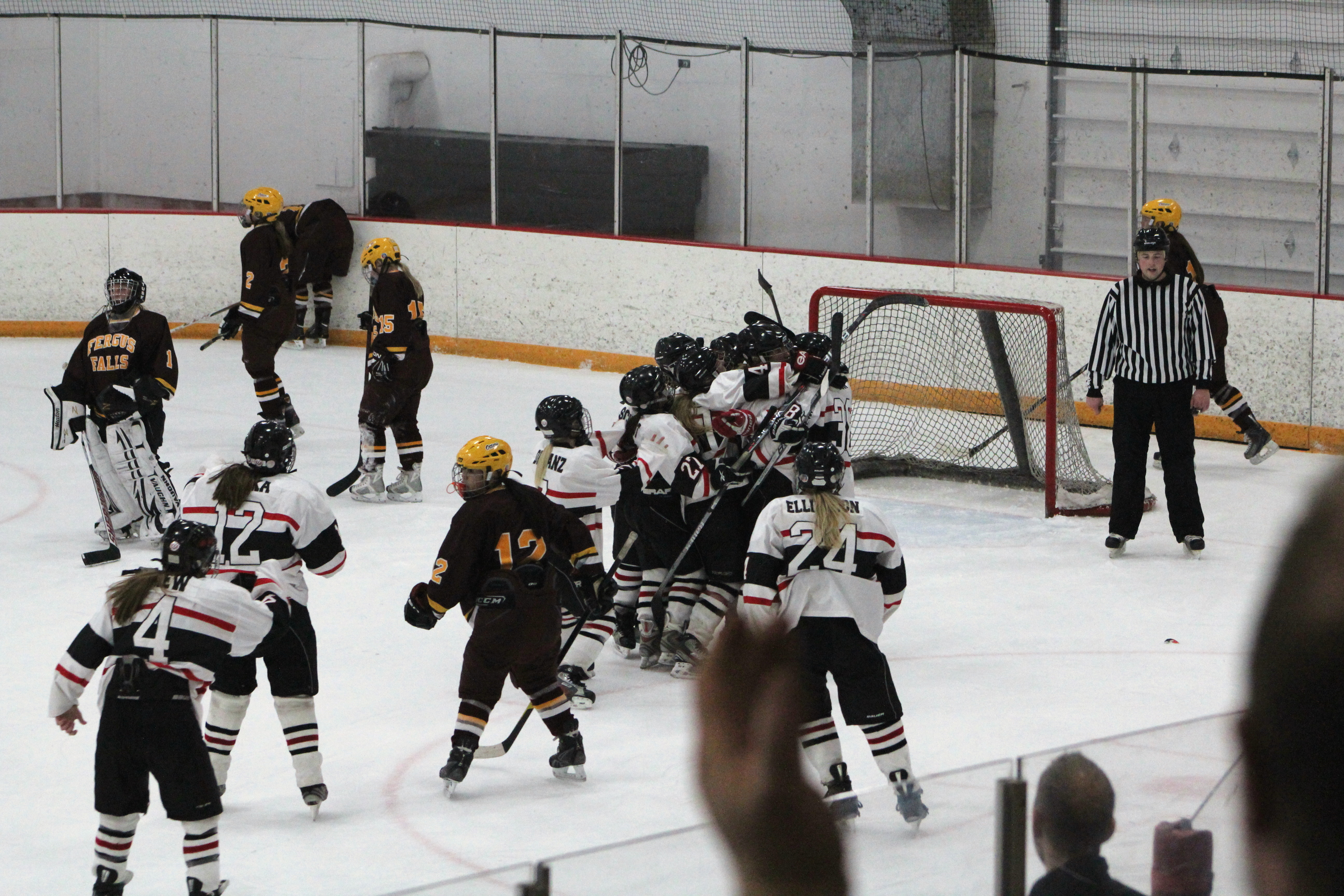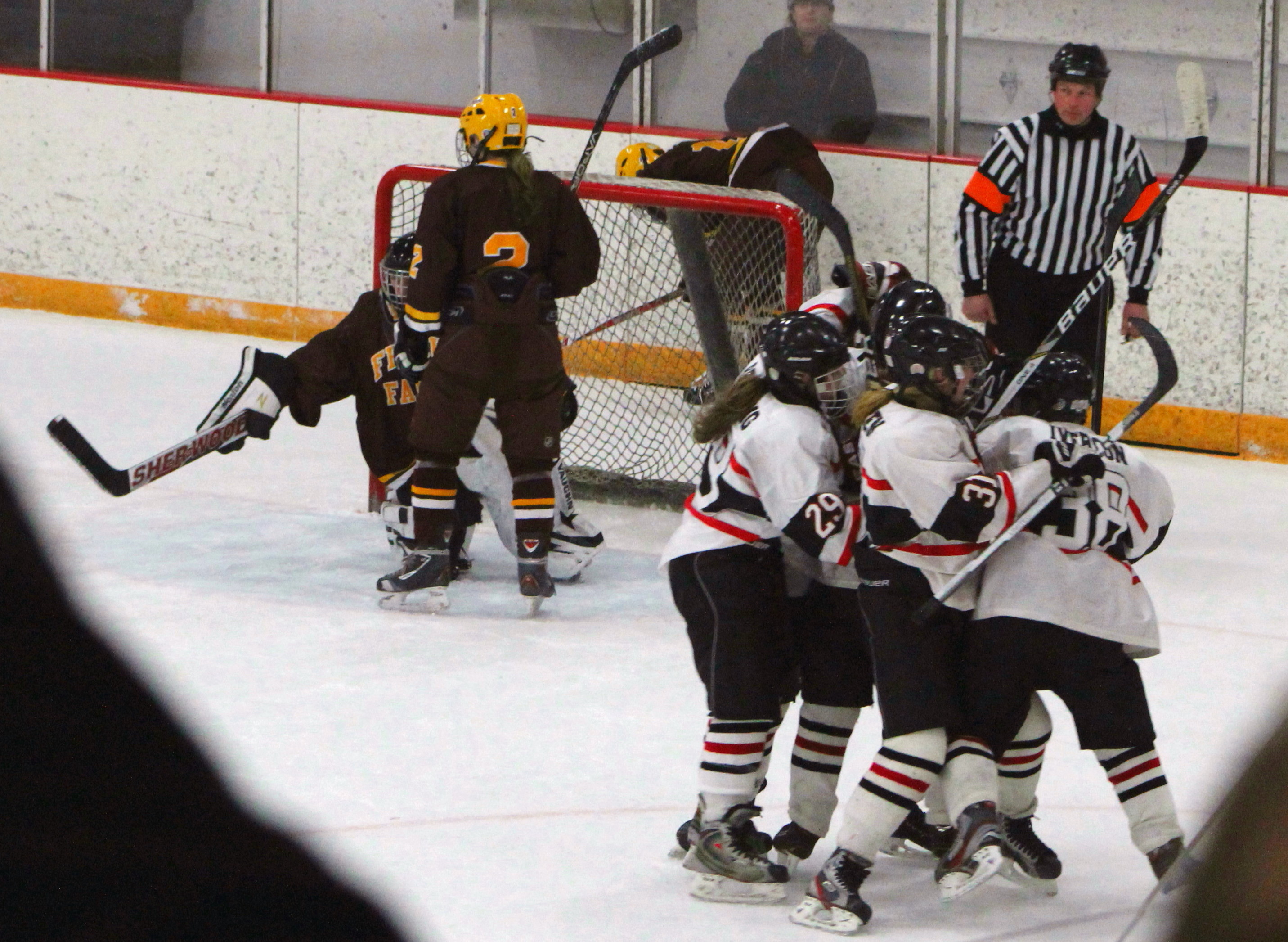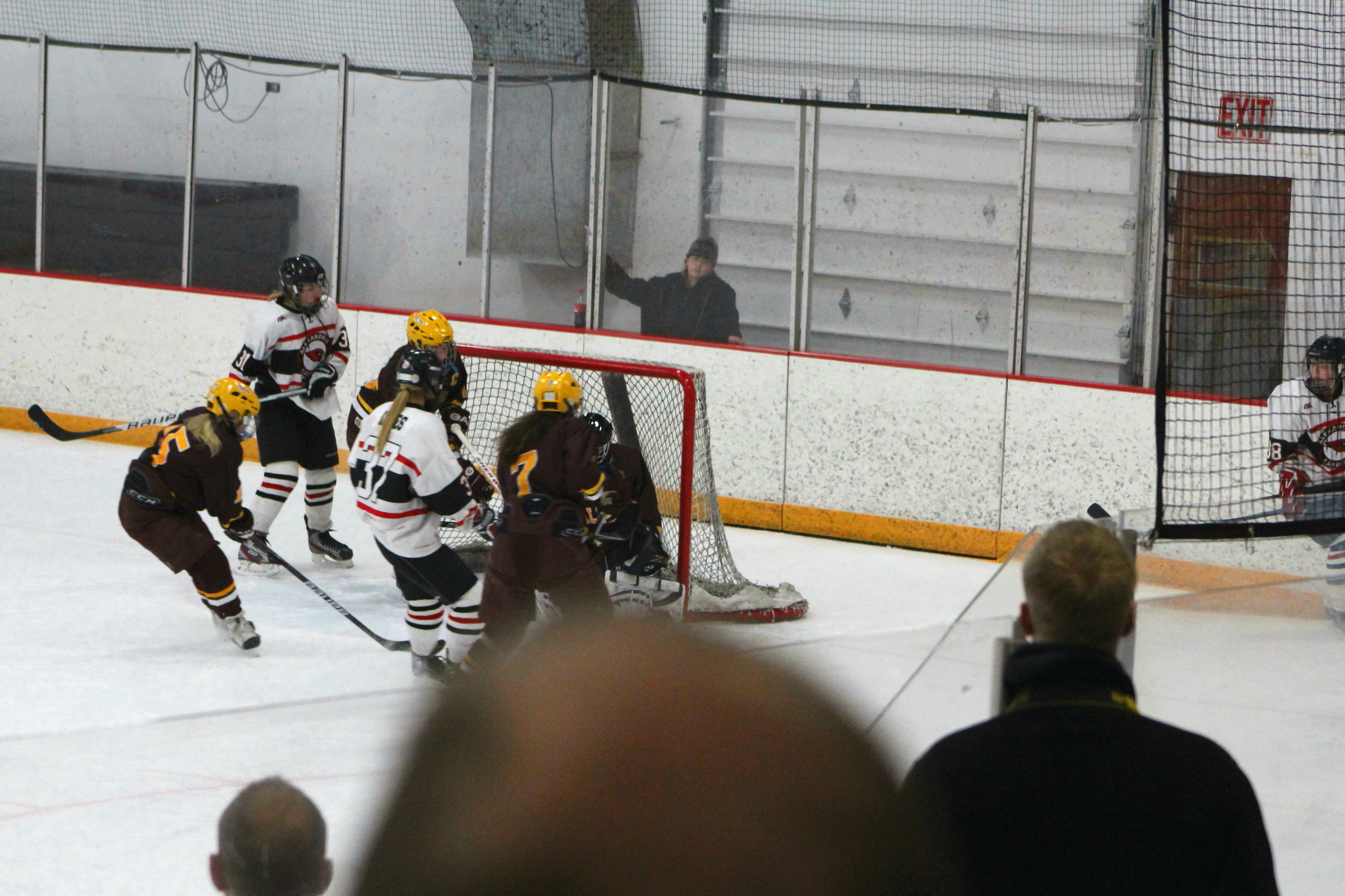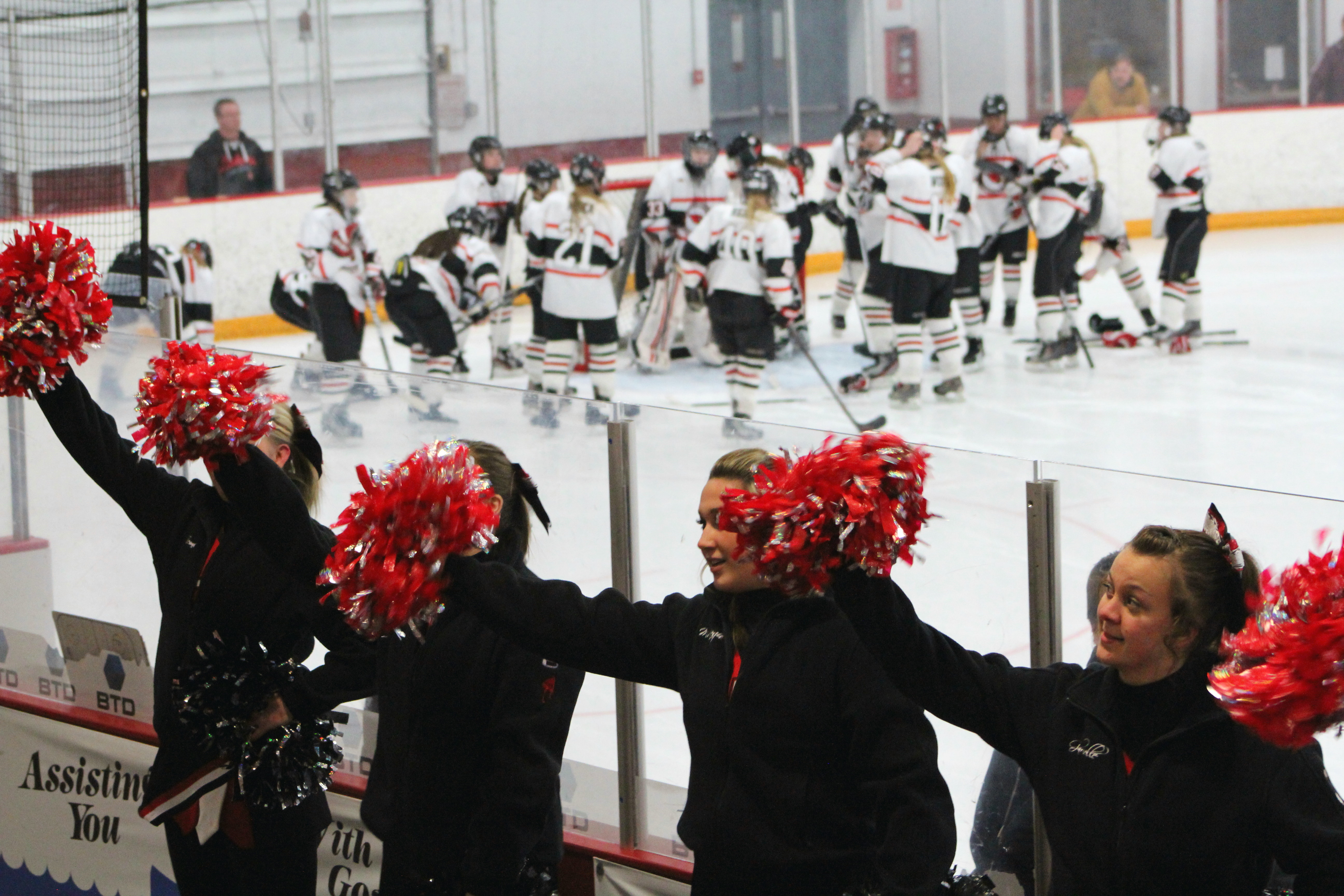 [Hockey moms, Shanee’s and Becca’s, rush the ice for photo ops.]