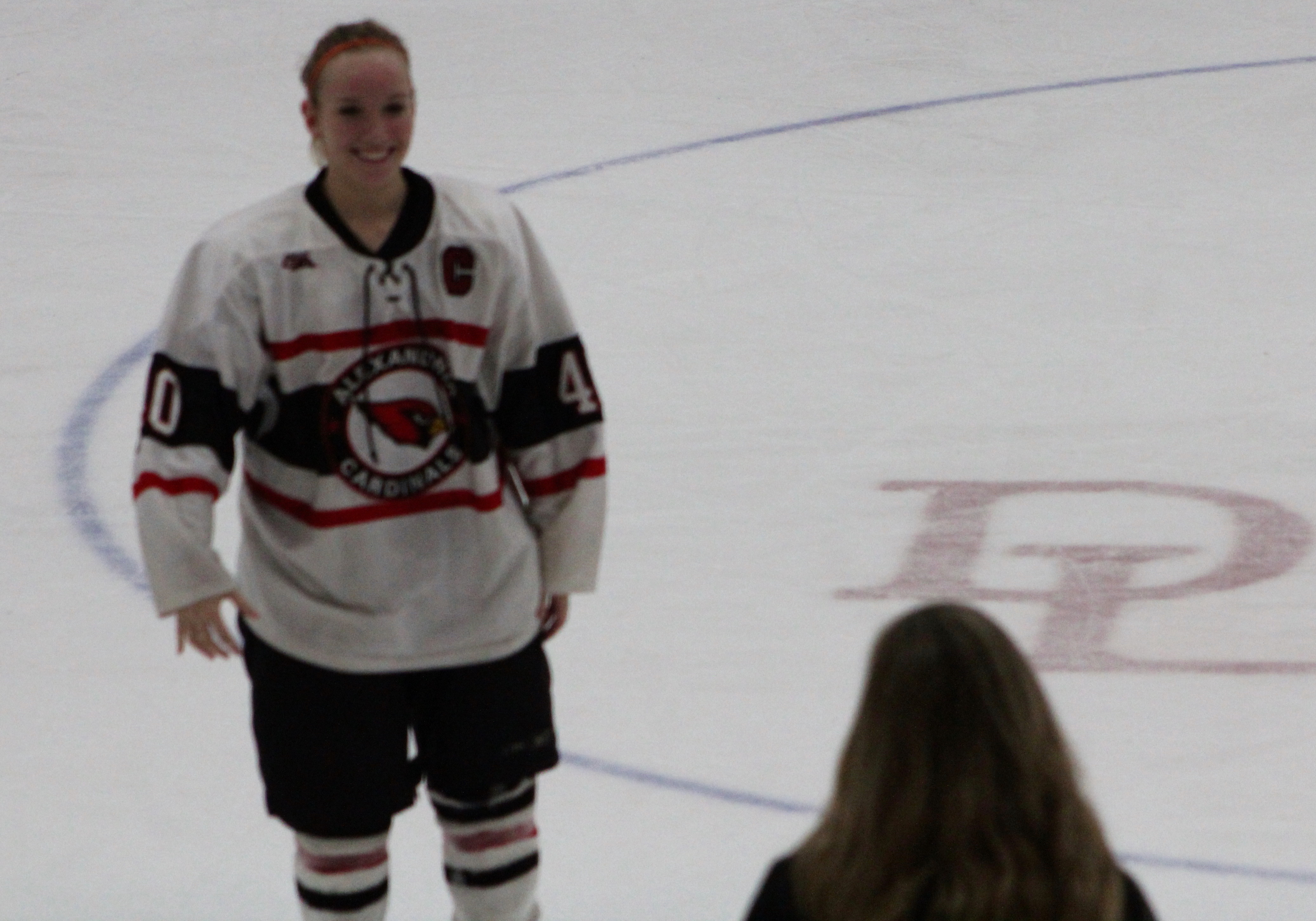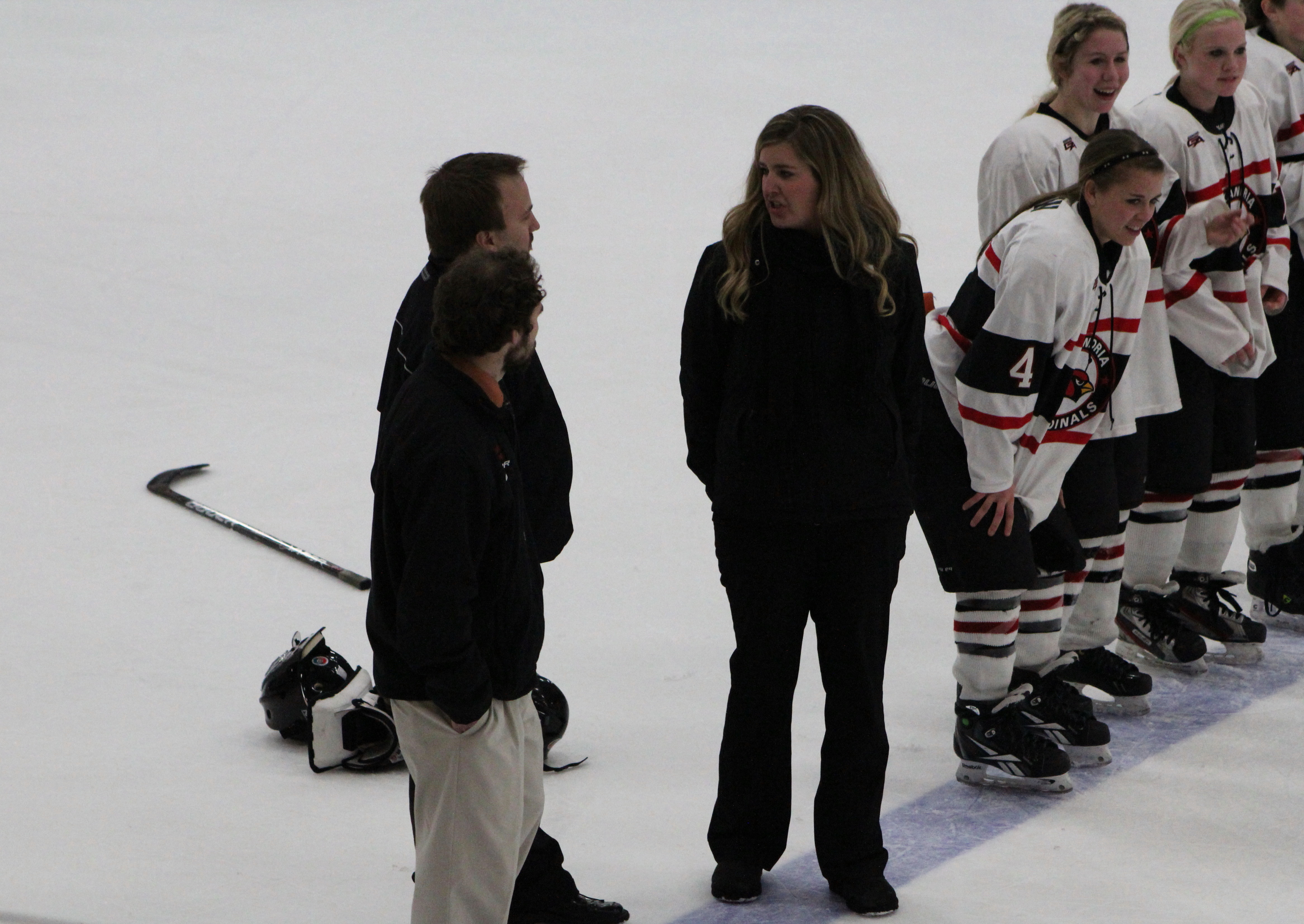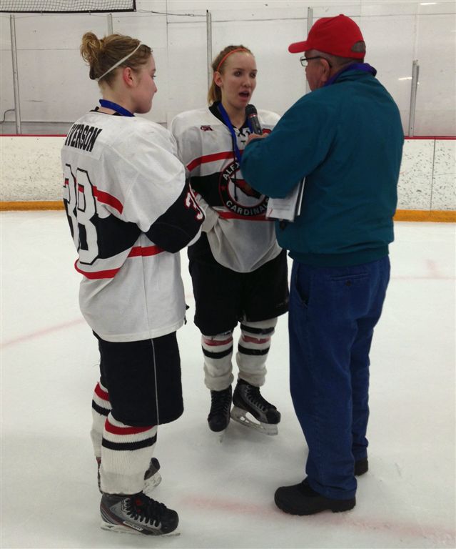 [Shelby with Britni DelCastillo, from last year’s team. Britni infortunately had to move to the Cities because . . . her dad is now the coach of the Hamline men’s hockey team!]