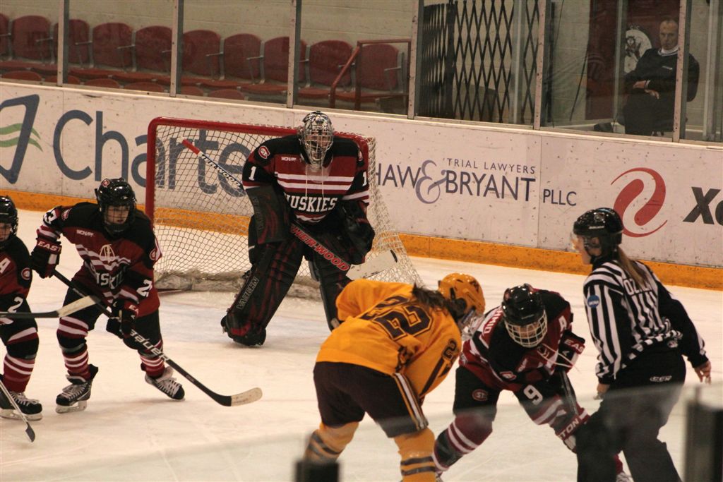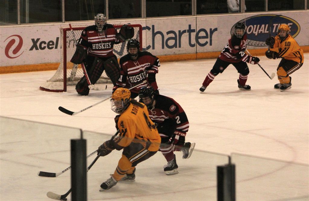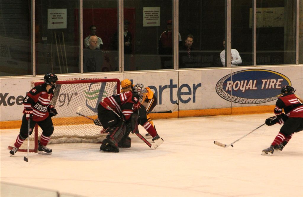 [Huskies threaten Gopher’s All-American Finnish senior goalie, Noora Raty (41).]