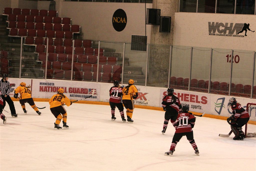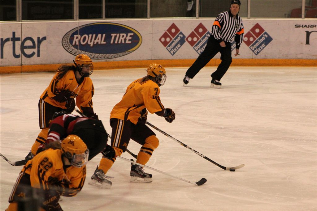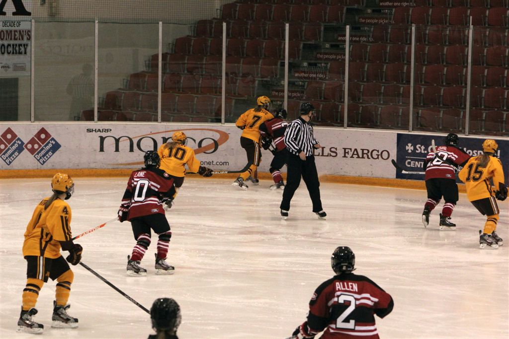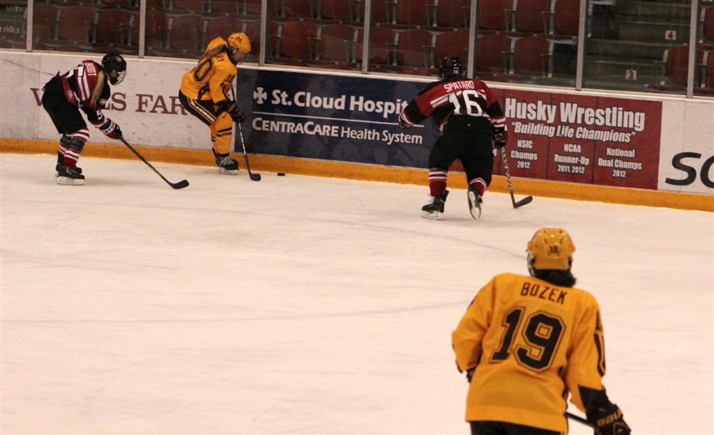 A more complete overview of the Gopher women’s hockey team will follow (at some point) concerning last weekend’s game with Bemidji State. But as I was really determined to see what is undoubtedly the best women’s college team of all time, one more time, I made the convenient trip to St. Cloud to watch them complete the first ever undefeated regular season. The 3 – 0 victory over the Huskies, though far from a masterpiece, extended their all-time record winning streak to 42 games! Probably the most impressive aspect of the team is the size of their defense! I believe their average height is greater than that of our boys’ high school basketball team my senior year. Above we have Mira Jalosuo (7), a 6-foot senior from Finland, playing catch with Milica McMillen (13), a 5’10” freshman from Breck (I believe I have mentioned this before, but if you look at the upper left border of this blog, you will see Milica as an 8th-grader playing for Breck against our Cardinal championship team in 2008). In the team photo at the top, Mira is joined by fellow 6-footer, Rachel Ramsey (5), sophomore from Minnetonka and daughter of NHL All-Star, Mike. They are joined by fellow elevated blue-liners, Lee Stecklein (2), 5’11” freshman, Roseville; Baylee Gillanders (27), 5’11” junior, Saskatchewan; and Megan Bozek (19), a relatively smallish 5’9″ senior from Chicago and the Gopher’s all-time leading scorer on defense. Shortly into the game, an OSHA inspector came in and momentarily stopped play long enough to distribute ear protection for all the fans as the sound of the slap shots rifled from the blue line by this group was ear shattering!