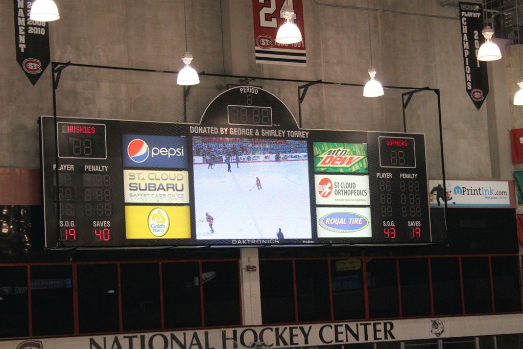 [The Gophers last score came on a 4-on-3 situation. The Huskies also had a player in the box on a 5-minute major penalty. The referees could not figure out who, if anyone, could come out of the penalty box after the goal. It went on for many minutes, discussions among the refs, between the refs and the coaches, and all the while the Husky fans are letting them have it! They ultimately decided no one was coming out – never figured that one out and the Husky fans were . . . not delighted?]