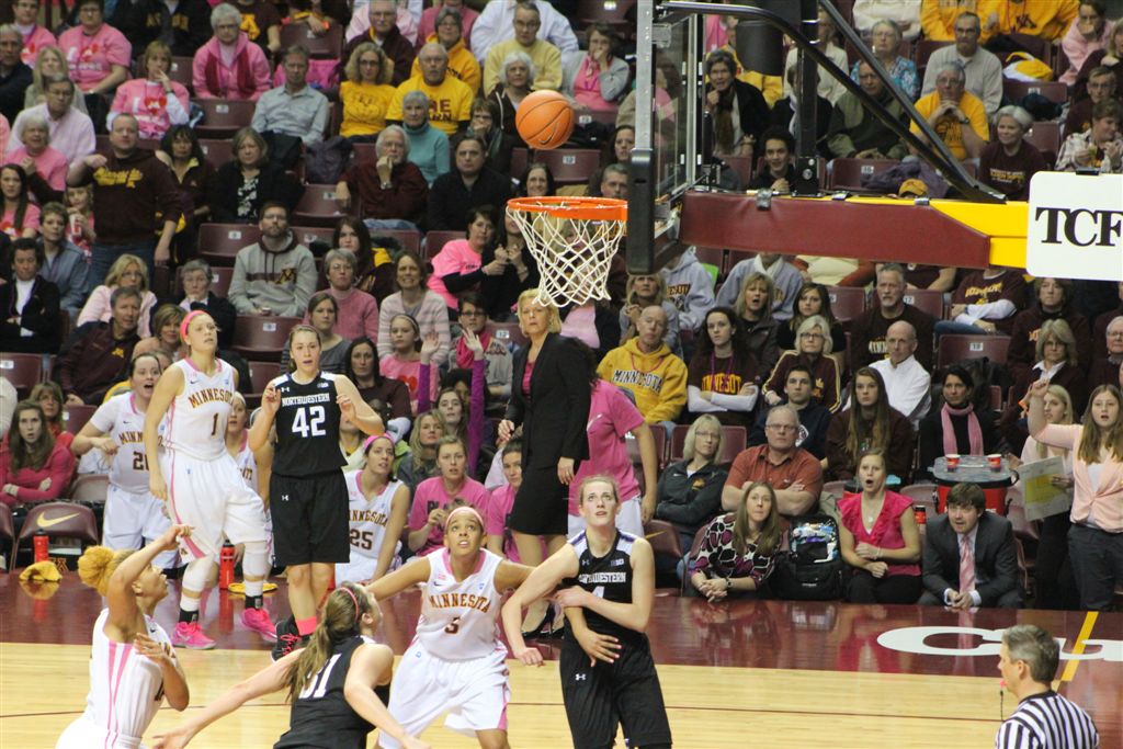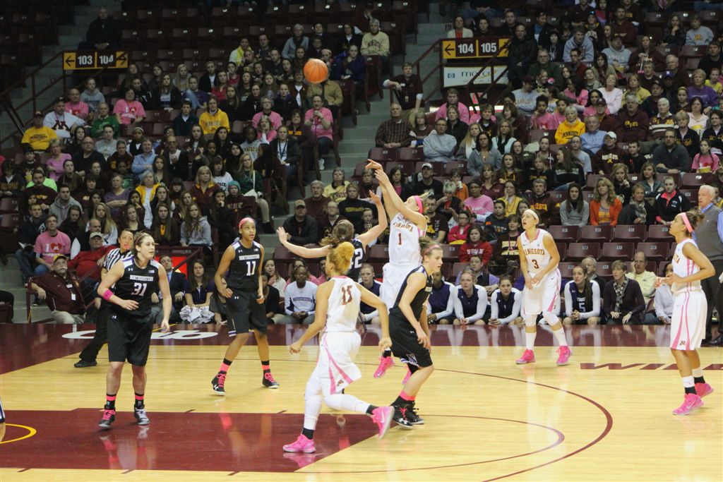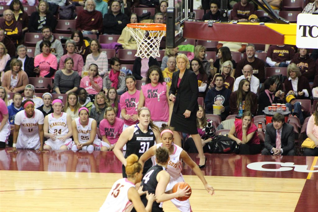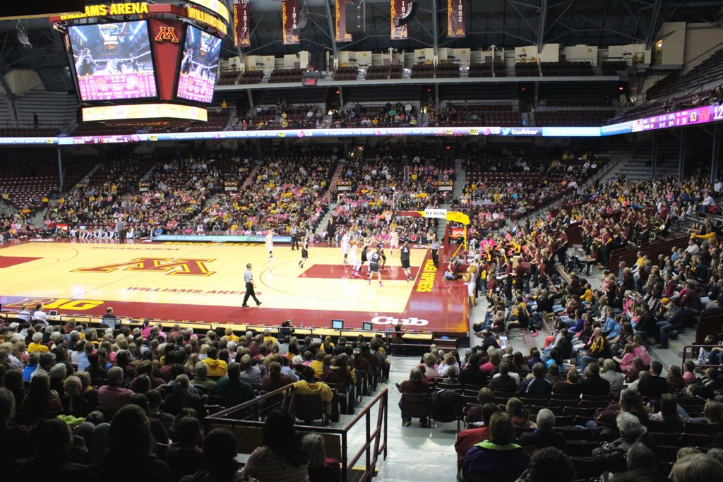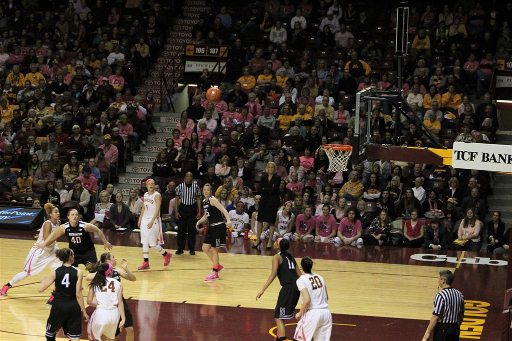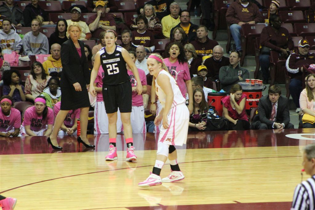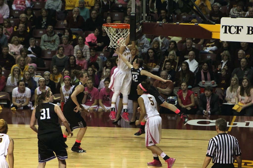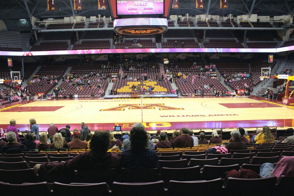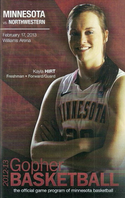 So now it’s the next day, Sunday. We went to Williams Arena to see the Gopher women’s basketball team play Northwestern. I have to be honest here – the Gophers are having an average year. I went to see Rachel Banham play. Rachel (1) is a 5’9″ sophomore guard from Lakeville and she leads the Big Ten in scoring. All the years Lindsay Whelan was starring for the Gophers, we always said we were going to gone down to see her play. We never did. I did not want to miss the next Lindsay Whelan.